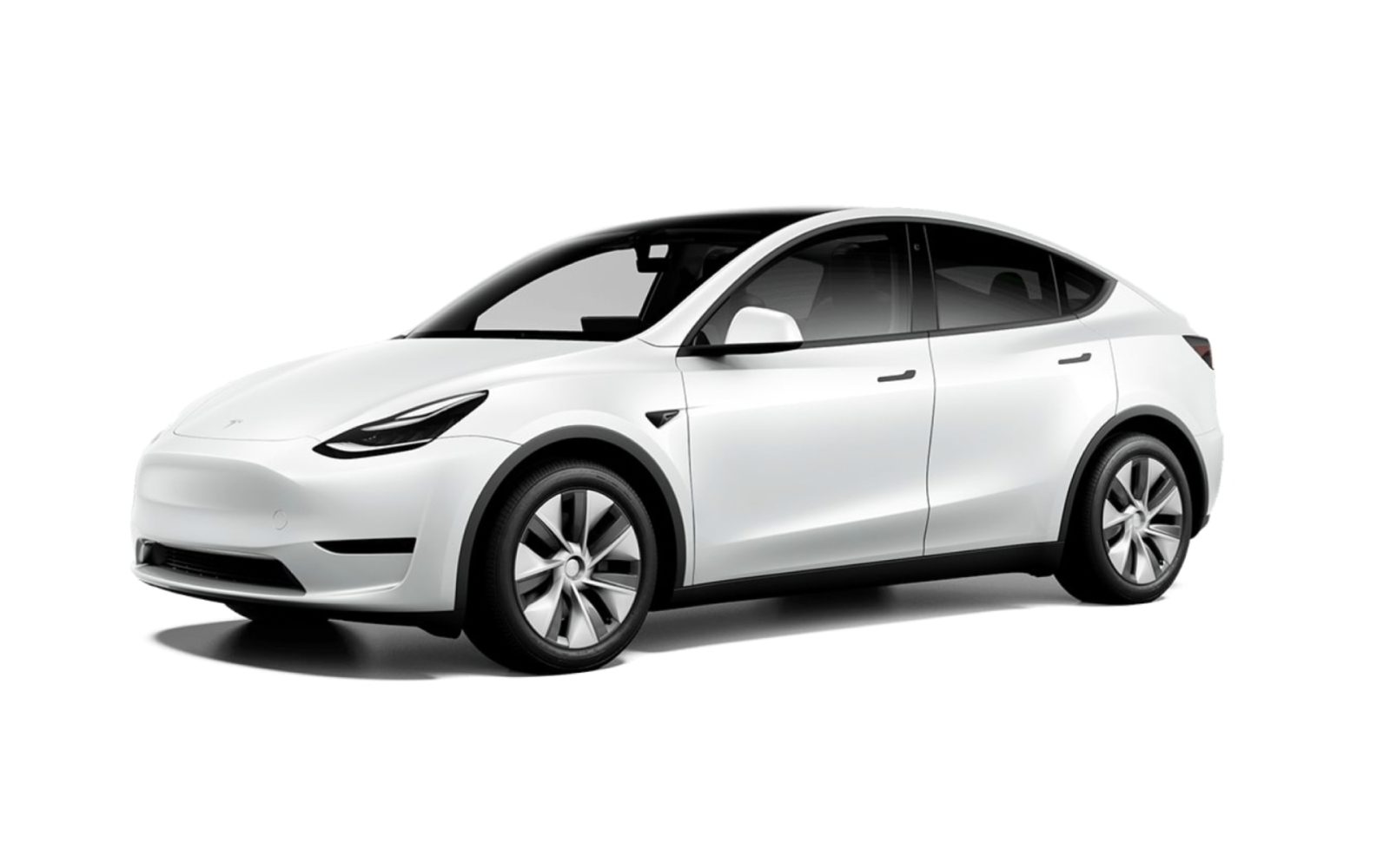 Een witte Tesla Model Y met een strak ontwerp, zwarte sieraccenten en grote lichtmetalen velgen, geparkeerd in een hoek waardoor de passagierszijde en voorkant zichtbaar zijn.