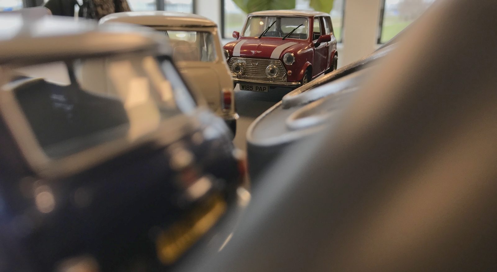 “De witte moet de oudste Mini voorstellen. Hij oogt als een Mini Mk III uit de jaren zeventig, maar op het achterklepje staat het woord SEVEN.”