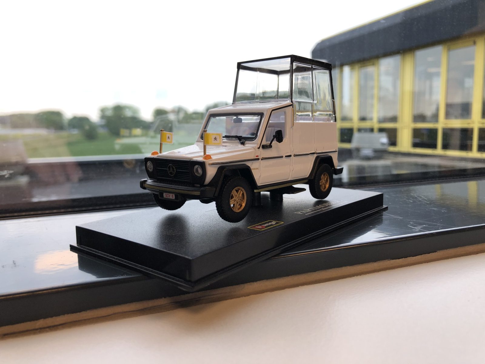 Onlangs verscheen bij Bburago de Papamobile op basis van de Mercedes-Benz G-Klasse. Bij uitstek een souvenir om mee te nemen als je het Vaticaan in Rome bezoekt. Het is sowieso een gek model, een hebbeding, met een grote glazen opbouw achterop.