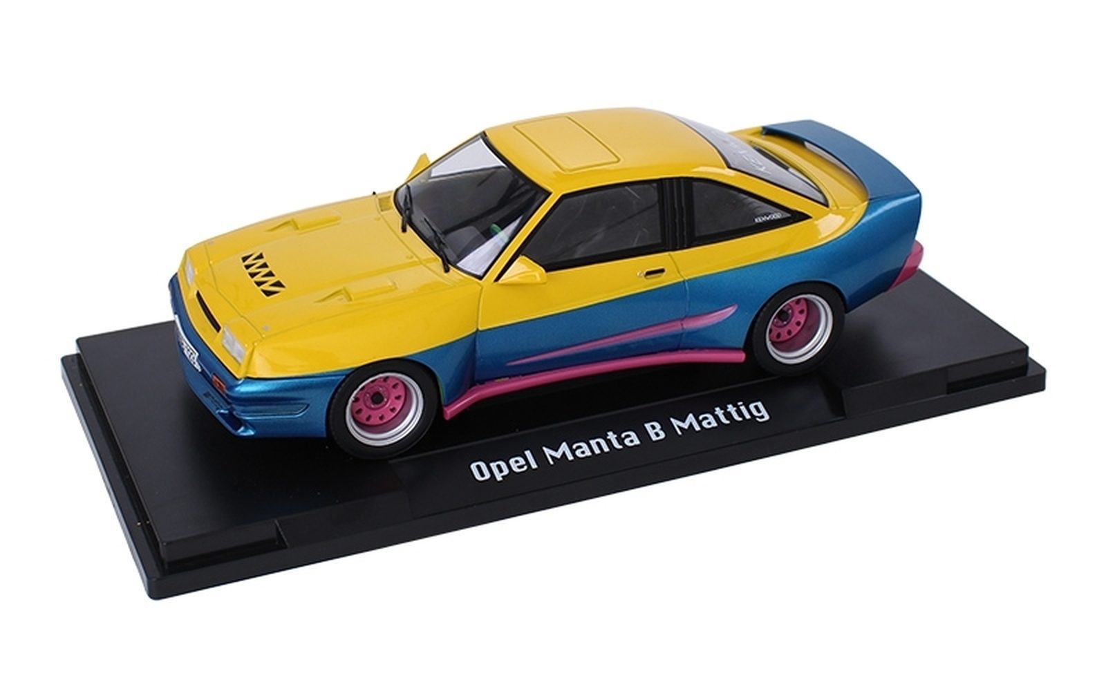 De fabrikant van dit moois is, zoals de doos duidelijk aangeeft, Model Car Group, een Duitse webwinkel die dus ook modellen in eigen beheer en onder diverse merken uitbrengt. De Opel Manta B Mattig van MCG kost in schaal 1 op 18 bijna 60 euro. De Manta Mattig is er overigens in meerdere schalen en prijsklassen. Alle modellen zijn zo smal dat de eigenaar aan beide zijden met zijn arm over het portier kan leunen. Genoeg Witze… miniatuurauto’s verzamelen is een serieuze aangelegenheid.