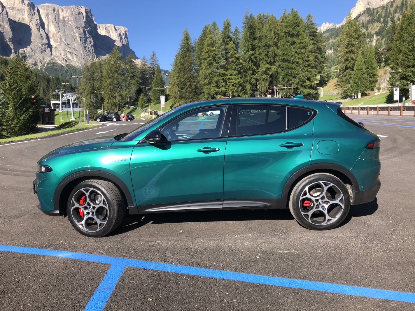 Om direct met de deur in huis te vallen: de Alfa Romeo Tonale is een lust voor het oog. Helemaal in deze groene kleur Verde Montreal in de uitvoering Veloce met de forse rood gekleurde remklauwen. De naam Veloce is voorbehouden aan de meeste krachtige modellen van Alfa Romeo. Bij deze Tonale vertaalt zich dat een plug-in hybride aandrijflijn waarbij alle vier de wielen worden aangedreven, met een 1,3-liter benzinemotor van 118 kW (160 pk) en een elektromotor van 90 kW (122 pk). Samen zijn ze goed voor een topvermogen van 206 kW (280 pk).