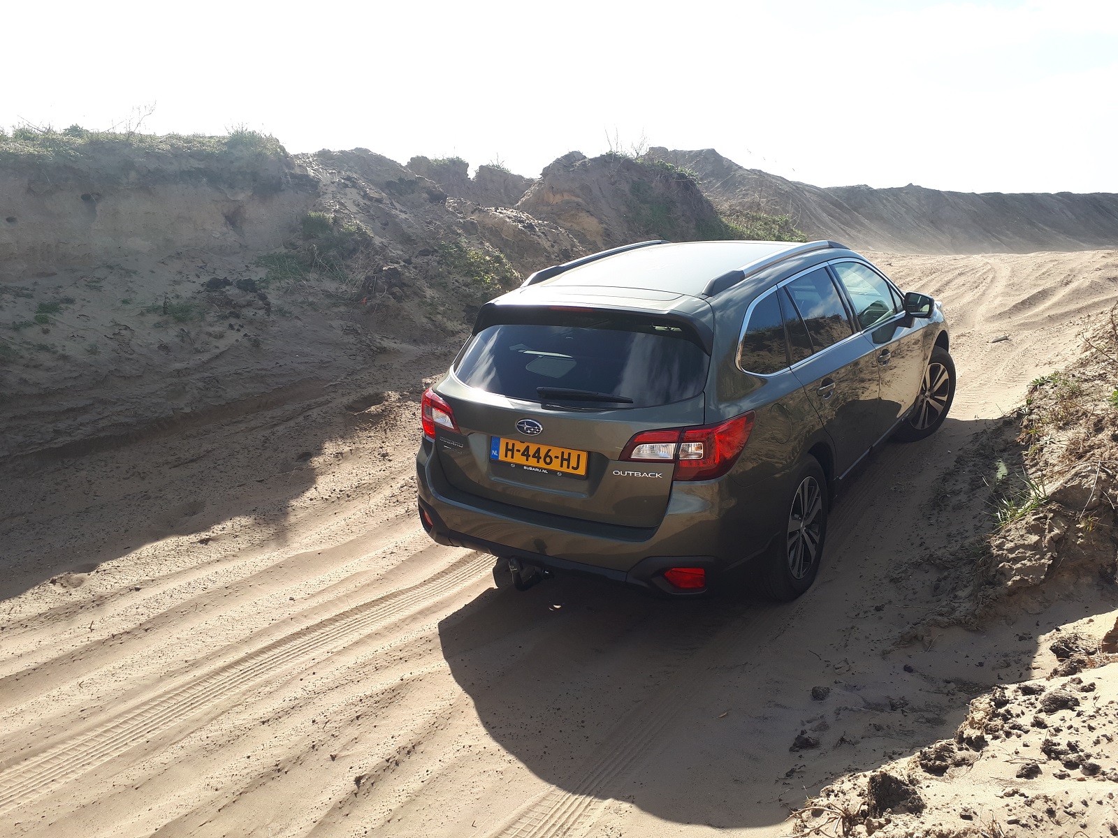 Al snel blijkt dat de Outback bijzonder weinig moeite heeft met rijden door mul zand, zelfs als dat een beetje tegen een helling op is. Daarbij is het verschil tussen beide standen merkbaar. In de ‘lichte’ stand kost het soms nog enige moeite om door de diepe zandsporen vooruit te komen, terwijl de Outback in de ‘zware’ X-Mode moeiteloos de zandheuvel over komt. Toch handig om te weten als je in de duinen of de bossen woont.