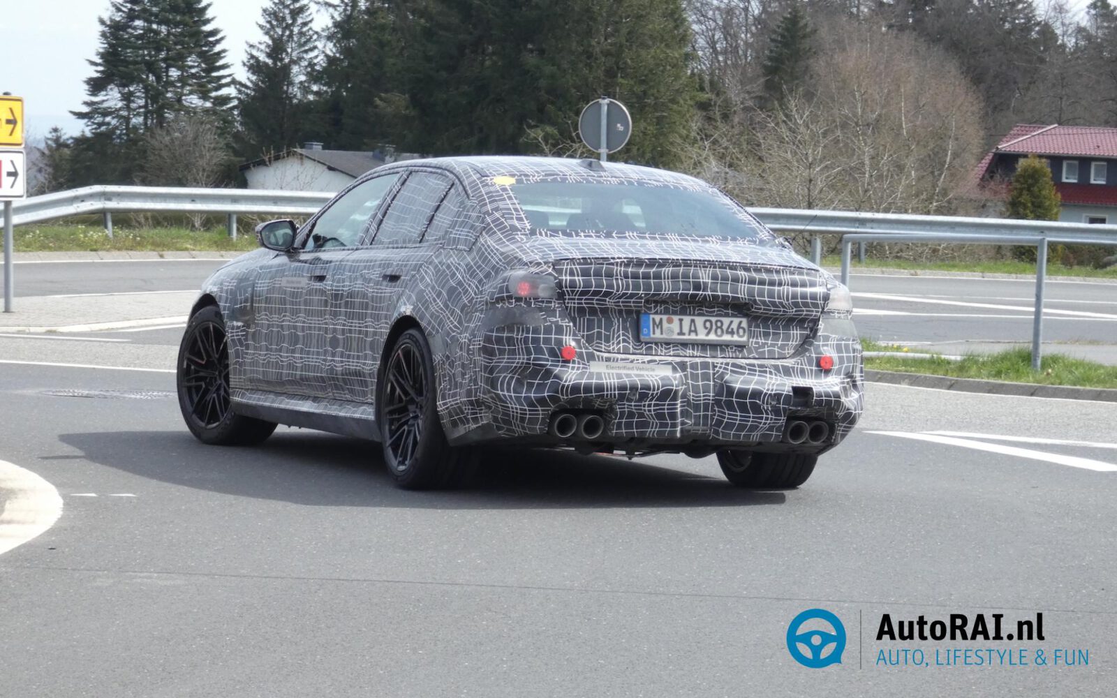 Vier vuistdikke uitlaten, geperforeerde remschijven met blauwe remklauwen, uitgeklopte wielkasten, dit kan om maar één uitvoering van de nieuwe BMW 5 Serie gaan: de BWM M5. Opvallend is de aanduiding ‘Electrificed Vehicle’ op de flanken en kont van de sportsedan. Aan de linkerkant van het voertuig bespeuren we ook een laadklepje. De nieuwe BMW M5 Sedan krijgt naar verwachting dus een krachtige plug-in hybride aandrijflijn. Reken op 700 pk of meer. Technische specificaties zijn nog niet bekend. De huidige BMW M5 Competition schopt het met geblazen V8-motor tot 625 pk.