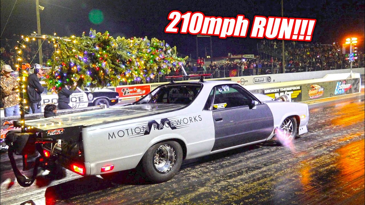 We hebben het hier niet over een paar vlotte auto’s, maar over serieuze dragsters, die binnen een paar seconden 300 km/u aantikken en een parachute nodig hebben om tot stilstand te komen. Niet alle kerstbomen hebben het dan ook overleefd.