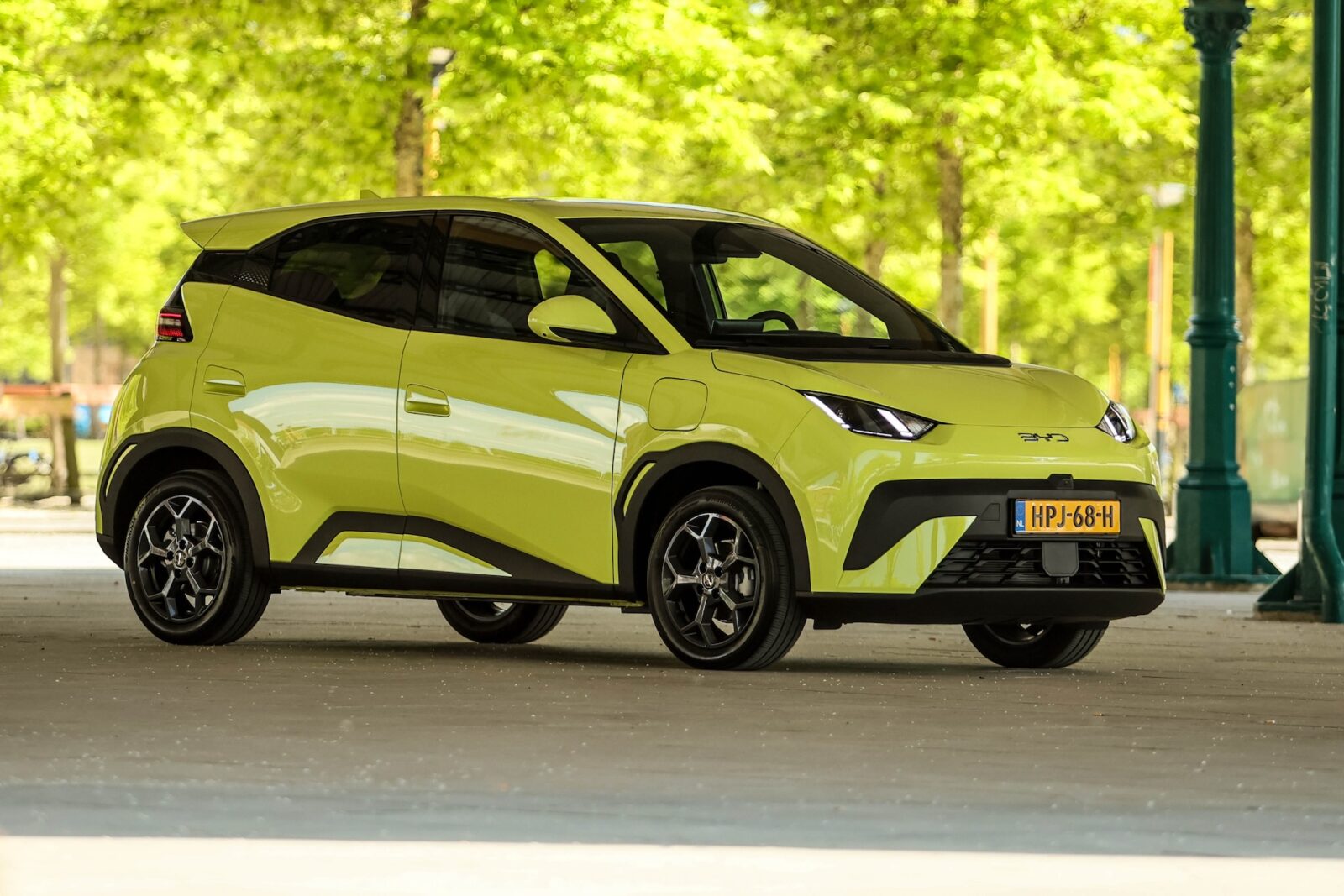 Het mag best gezegd worden: die BYD Dolphin Surf is een vrolijk karretje. Helemaal als je hem in een goede kleur besteld. Er is keuze uit Lime Green, Apricity White, Ice Blue en Polar Night Black. Lime Green is overigens de basiskleur. Leuk! Polar Night Black, Apricity White en Ice Blue zijn leverbaar voor een meerprijs van 650 euro. Standaard staat de auto op 15-inch lichtmetaal, maar de Boost en Comfort-versie hebben 16-inch lichtmetaal.