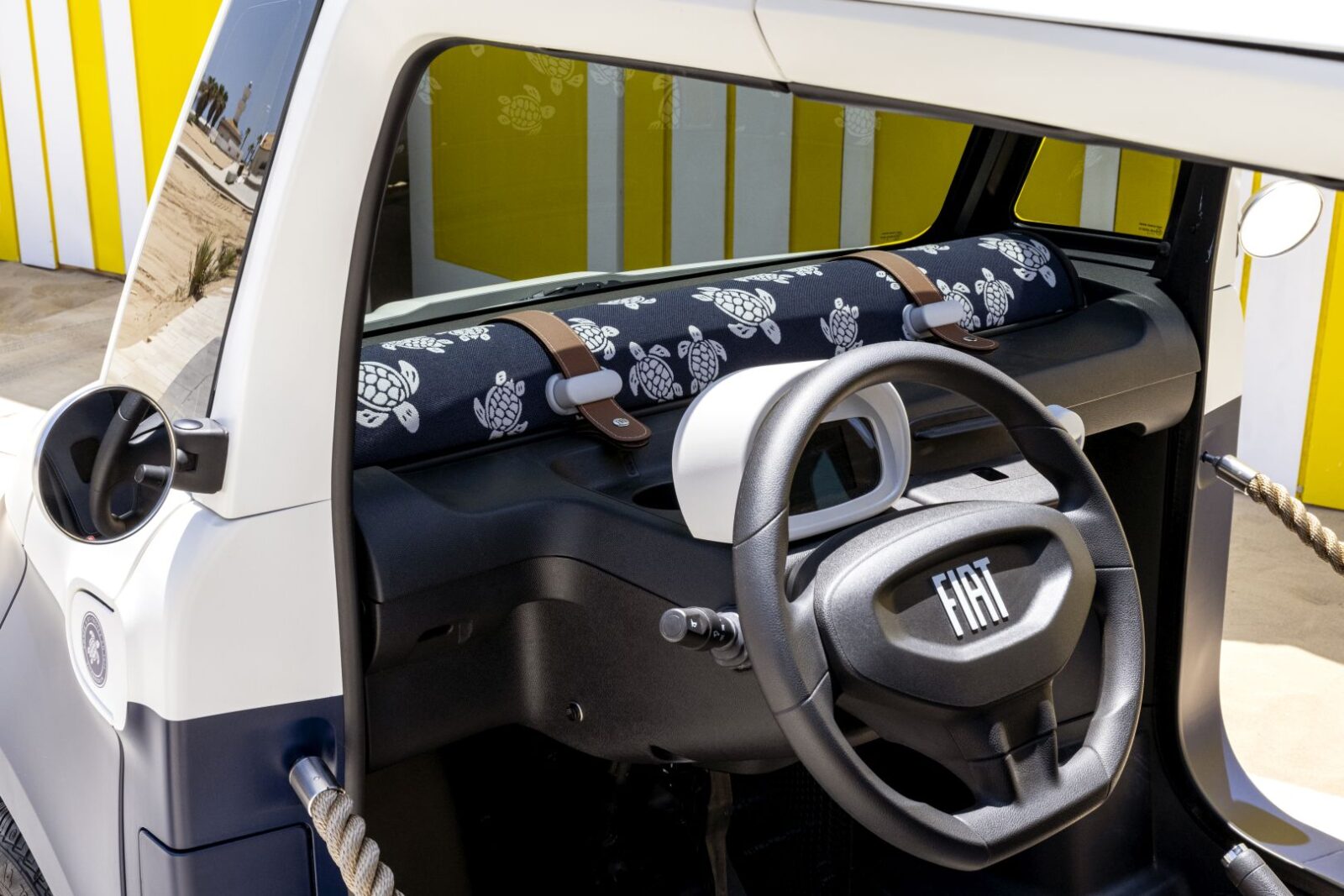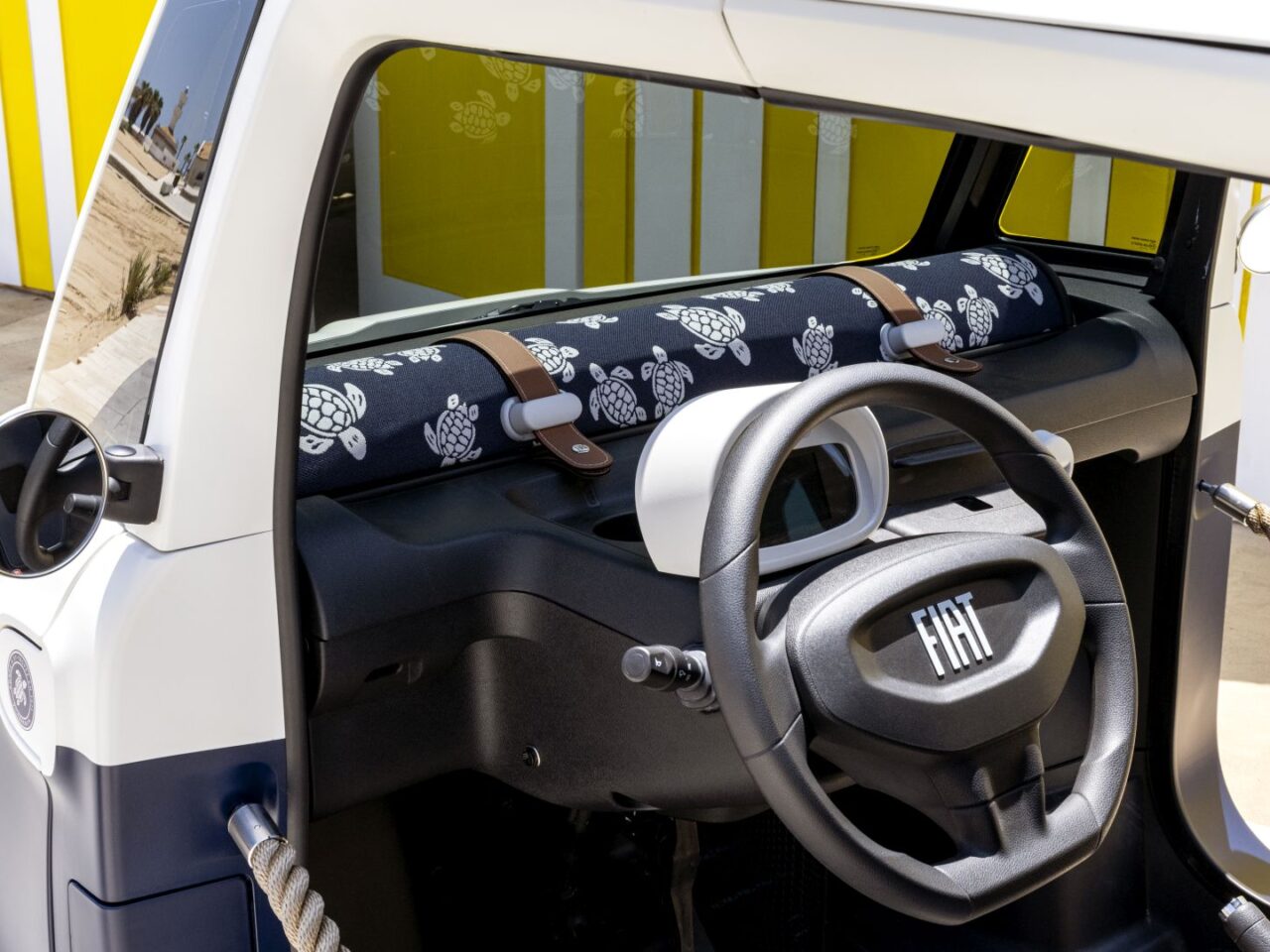 De Fiat is uitgevoerd in wit met Marine Blue, geïnspireerd op de kustkleuren van de Franse Rivièra. Binnenin is de sfeer uiteraard ook lekker zomers. De stoelen hebben het Vilebrequin-logo, de dorpels zijn afgewerkt met chroom en op de vloer liggen houtenaccenten die doen denken aan een jachtdek. Elke koper ontvangt een zogeheten Dolcevita Box met accessoires en een brief ondertekend door de CEO’s van beide merken. Ook de sleutel draagt het schildpadlogo van Vilebrequin. Achterop zit een klein bagagerek met ingebouwde douche – handig voor als je naar het strand gaat.