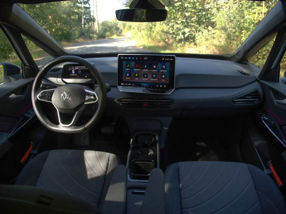 En binnenin? Geen zorgen – de bluetooth-speaker kan thuisblijven. Het standaard audiosysteem klinkt prima en heeft zelfs speakers achterin, iets wat vroege ID.3’s nog misten. Het interieur is verder donker en zakelijk, maar voelt allesbehalve goedkoop. De afwerking is degelijk, de stoelen zitten goed (je krijgt zelfs armsteunen!), er is sfeerverlichting en het 12,9-inch touchscreen reageert vlot. Navigatie ontbreekt, maar dat is nauwelijks een gemis: Apple CarPlay en Android Auto doen hun werk uitstekend.