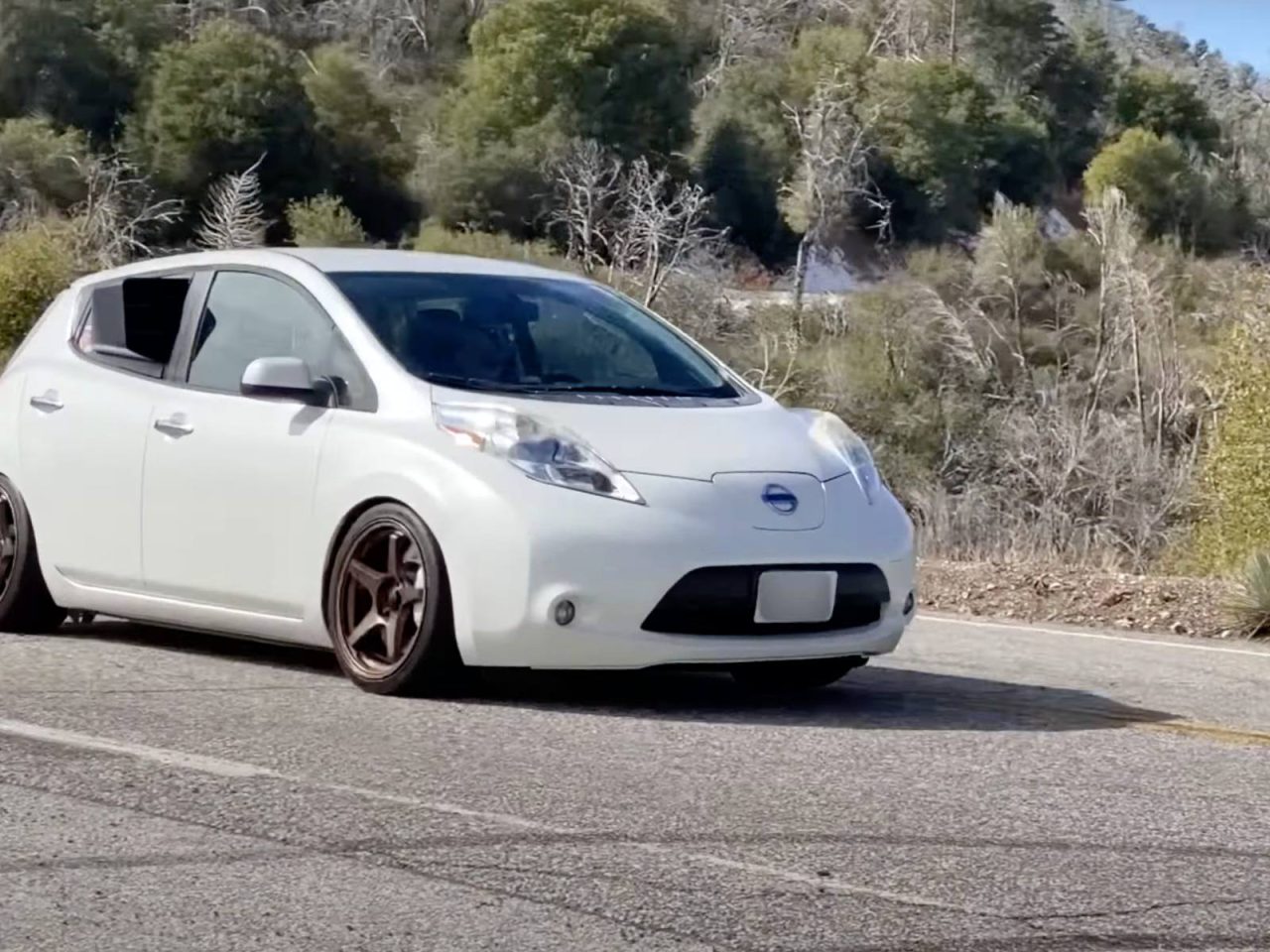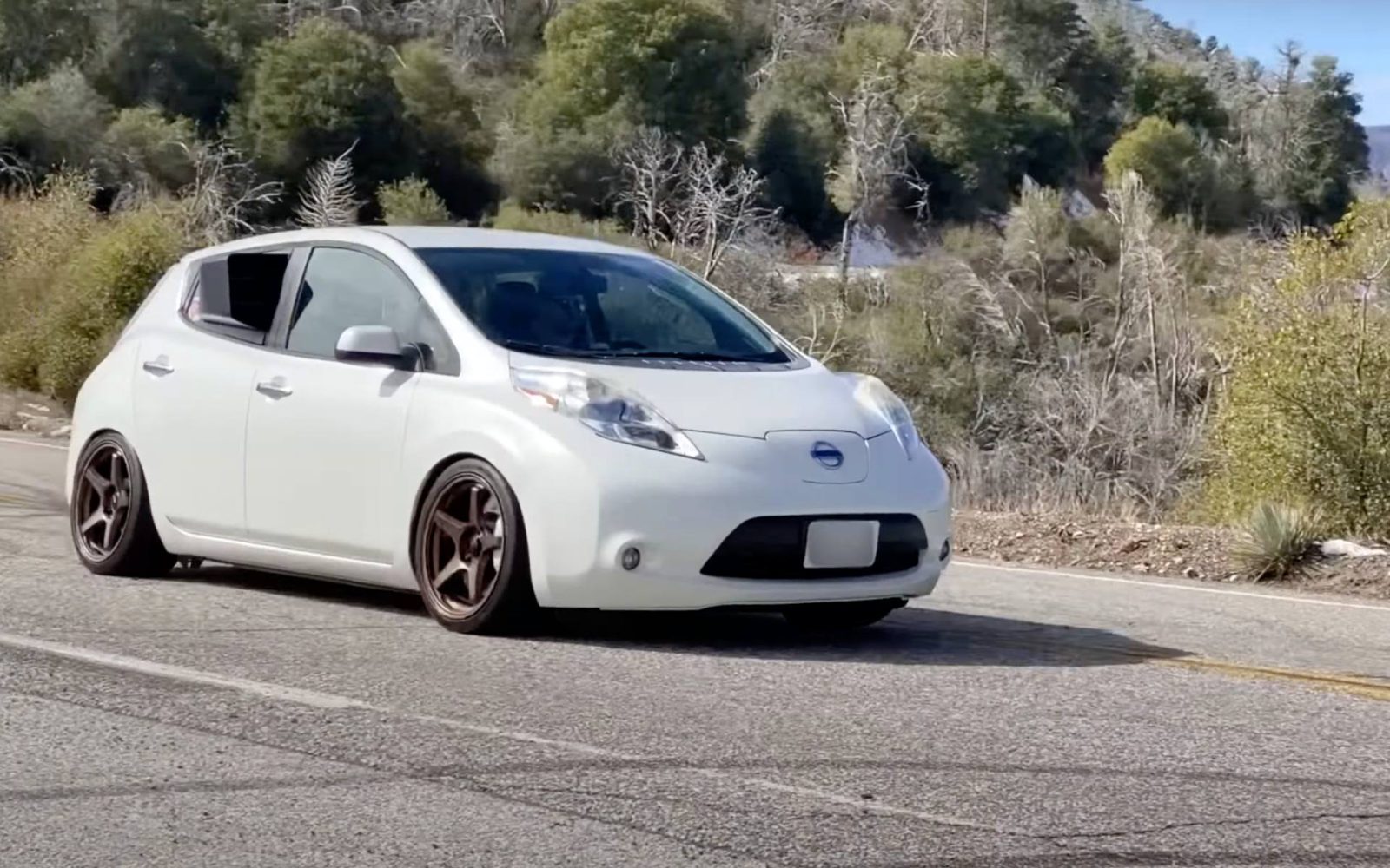 Het is natuurlijk niets nieuws: een hoogtoerige krachtbron uit een motorfiets installeren in een auto. Het was alleen nog niet eerder gedaan in een Nissan LEAF. De eigenaar – SuperfastMatt geheten – ging nog een stapje verder. Hij installeerde ook componenten van een Nissan 370Z, Ford Mustang en Lexus IS350. Het resultaat is een aanzienlijk lichtere en vooral beter sturende LEAF met een vermogen van 280 pk. Het leukste van dit alles: 13.000 toeren per minuut!