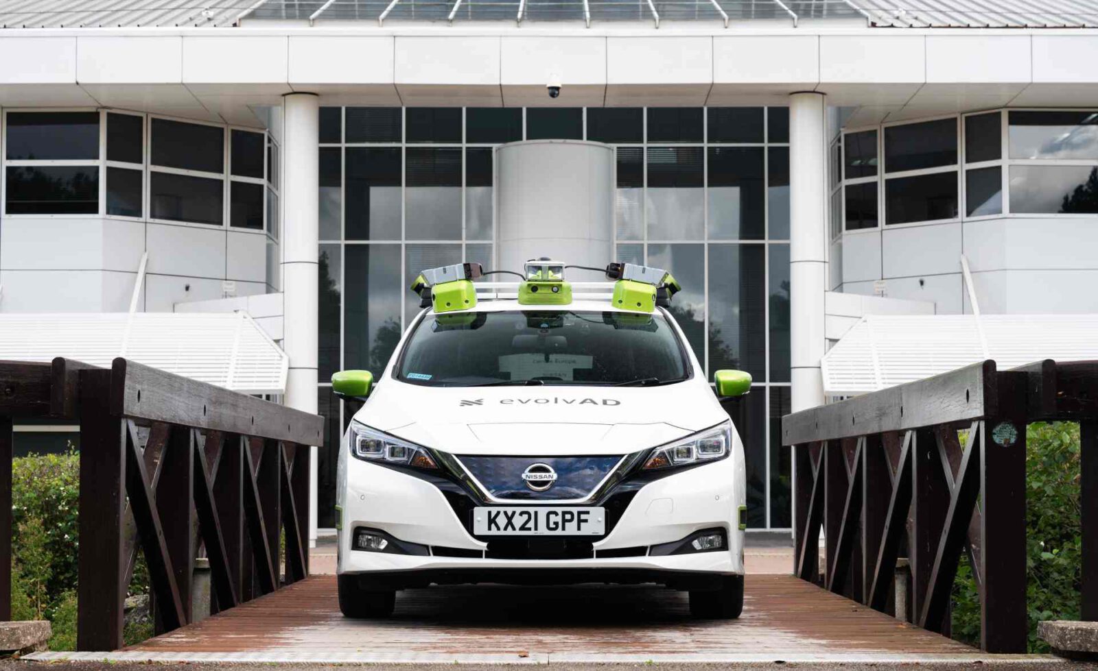 Nissan doet in Cranfield ook onderzoek naar autonoom rijden. In een soort laboratorium toont Nissan ons trots een Leaf met een hele rits aan camera’s en sensoren op het dak. De auto is onderdeel van het evolvAD-project, een nieuw onderzoeksinitiatief op het gebied van autonoom rijden (AD) waarbij Nissan betrokken is.