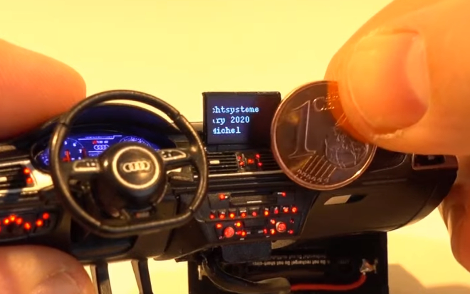 Wat doe jij in je vrije tijd? Tuinieren? Beetje Netflixen? Miniatuurtechneut Jakob Michel ontwikkelde een minuscuul schermpje om in te bouwen in zijn 1:18 Audi RS6-dashboardschaalmodel. Het display is kleiner dan een 1-eurocent-muntje.