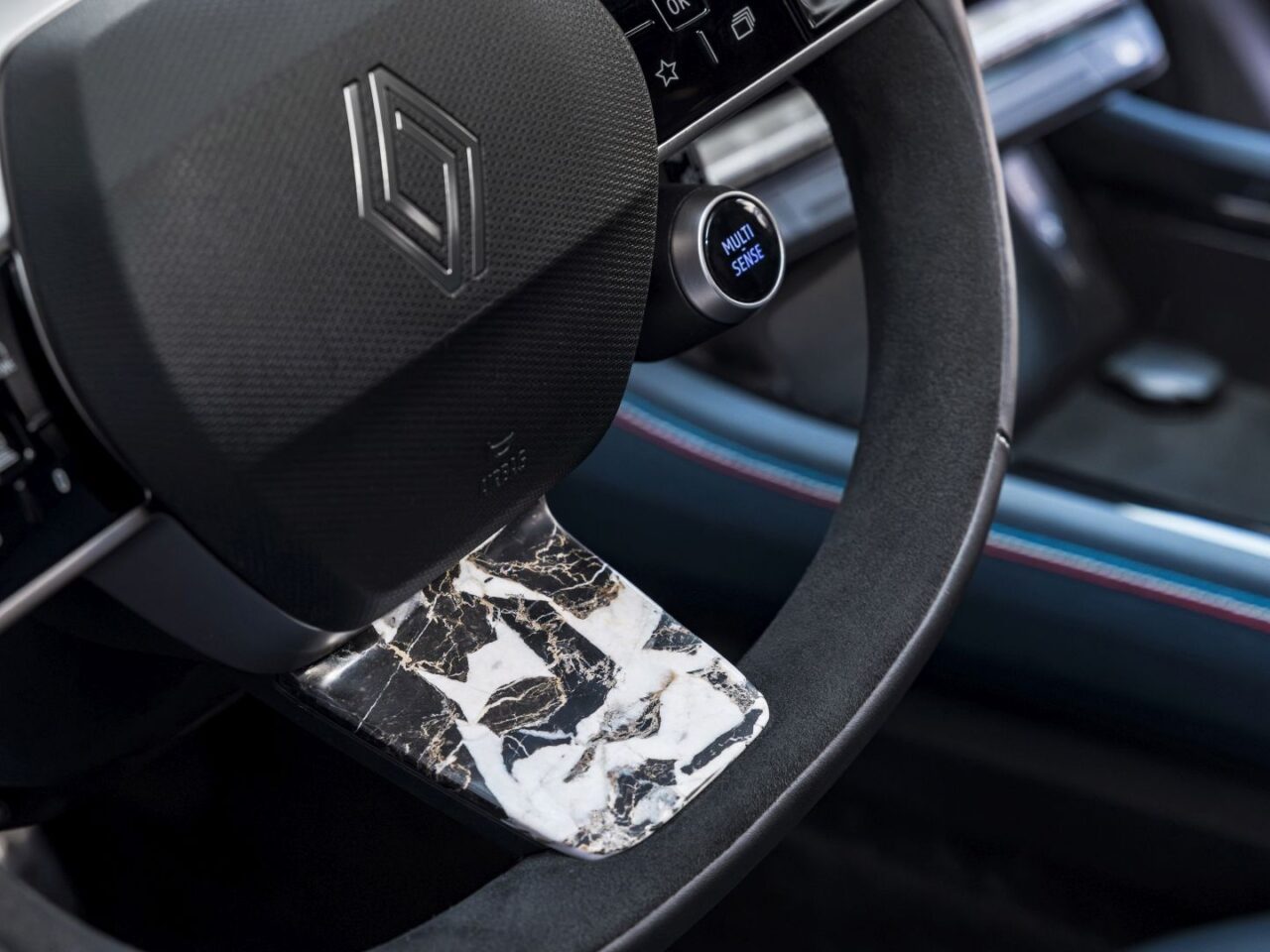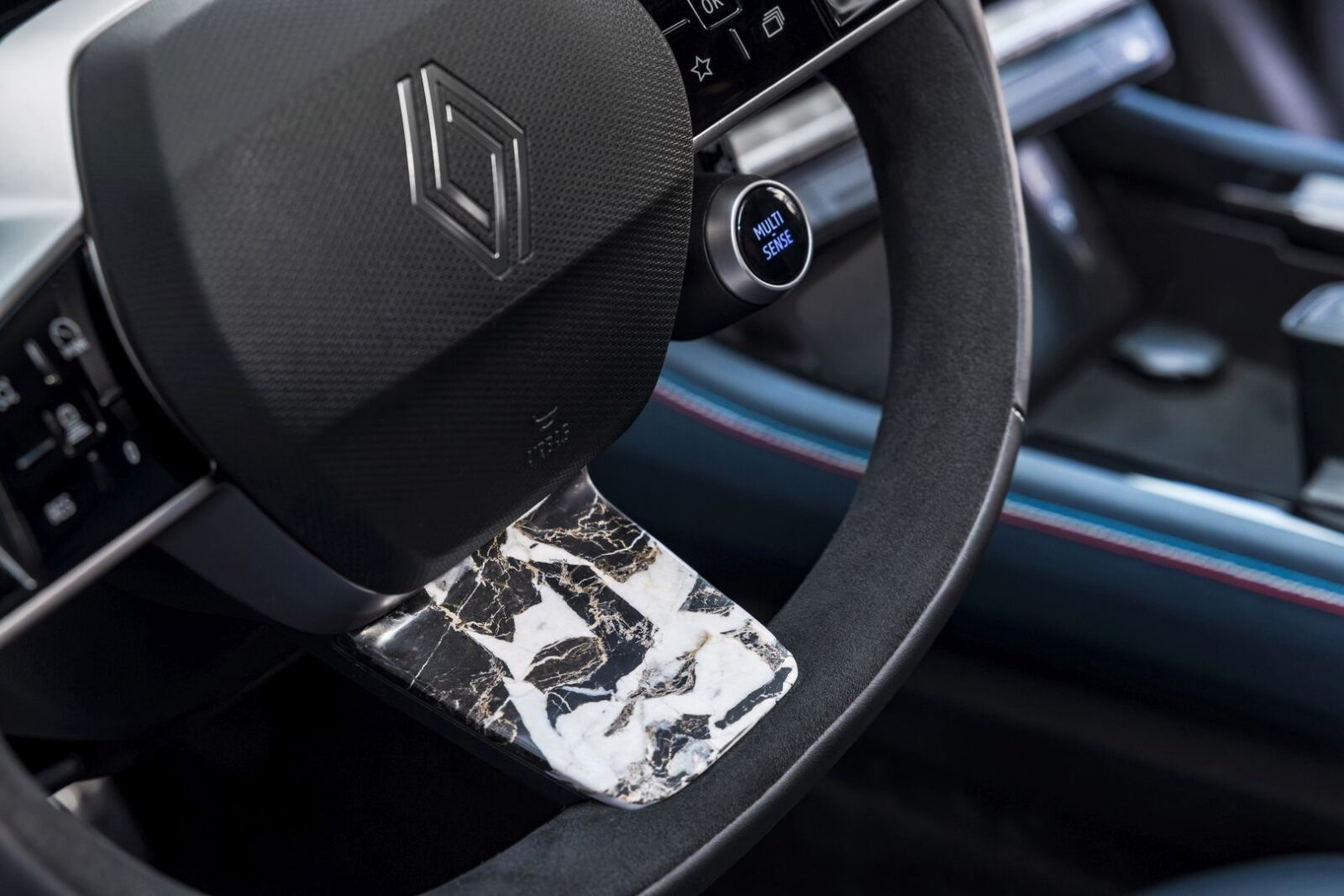 Renault heeft echt flink uitgepakt met het interieur. Zo ligt er écht marmer op de middenconsole, het dashboard én het stuur. Niet zomaar een tegel van de bouwmarkt, maar Noir Grand Antique-marmer uit de Pyreneeën. Voor het houtwerk schakelde Renault de Parijse meubelkunstenaar Ludovic Avenel in, die het dashboard voorzag van met de hand ingelegd beukenhout. Zelfs het stiksel van de stoelen is afgestemd op de officiële Franse kleurencodes. Dat heet dus aandacht voor detail.