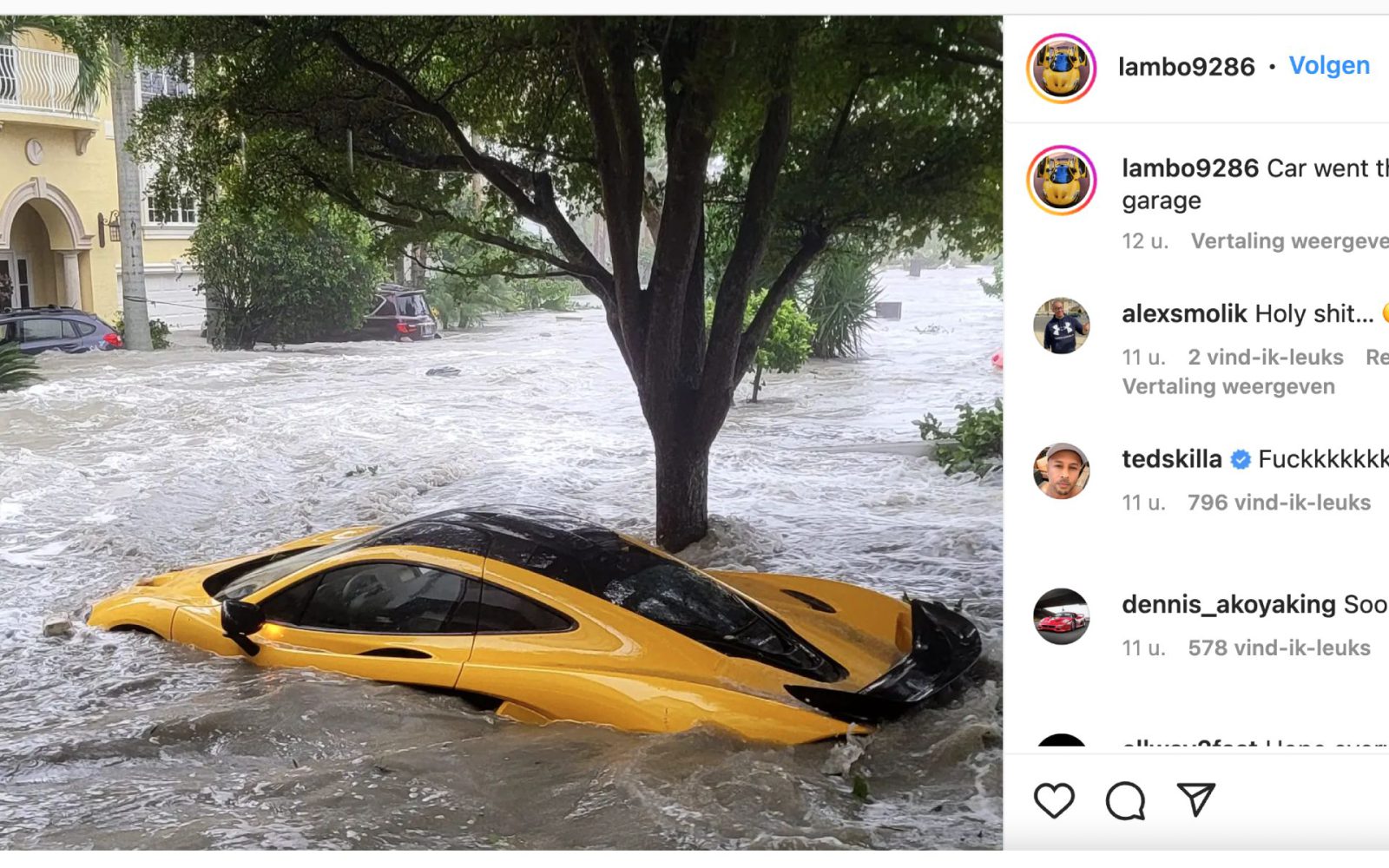 Maar helaas: orkaan Ian heeft ook zijn McLaren te pakken gehad. Op Instagram deelt hij een foto waarbij zijn P1 compleet onder water staat. Roesten zal de P1 niet, want hij is volledig opgetrokken uit koolstofvezel en andere lichtgewicht componenten. Maar triest is het wel. Ernie lijkt er nuchter onder te zijn. Wie zich een P1 kan veroorloven, kan vast en zeker ook de verzekeringspremie betalen.