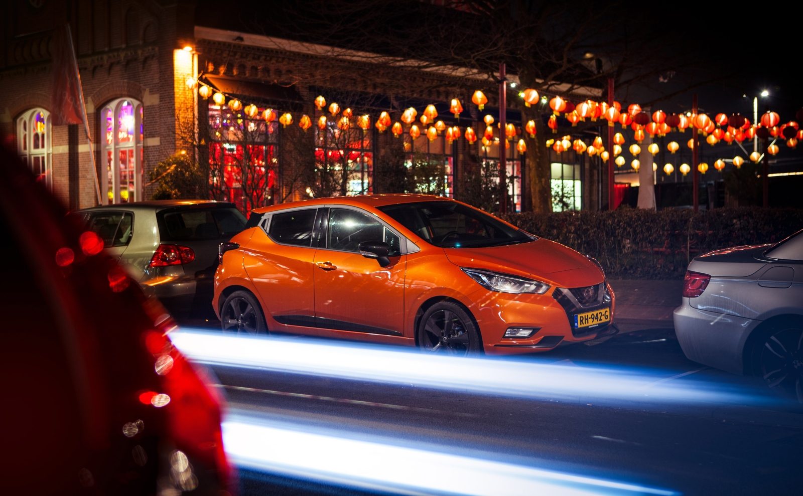 Mijn testkilometers spelen zich voornamelijk af op de snelweg tussen werk en huis. Ook op hogere snelheid stuurt de Micra strak en ligt stabiel op de weg. Fijn! Vanuit stilstand houdt hij bij een toerental van 2.000 redelijk in wat resulteert in een vervelende bokkesprong. Minder fijn. Op een avond spot ik een lege parkeerplek voor een Aziatisch restaurant bij mij in de straat. Vlug loop ik naar huis om de Micra en camera op te halen. Perfecte fotolocatie want die rode Chinese lantarens matchen goed met de oranje lak van de Nissan! Zo geparkeerd tussen allemaal Duitse merken valt ie toch best wel op. En volgens mij ligt dat niet alleen aan de opvallende kleur.“
