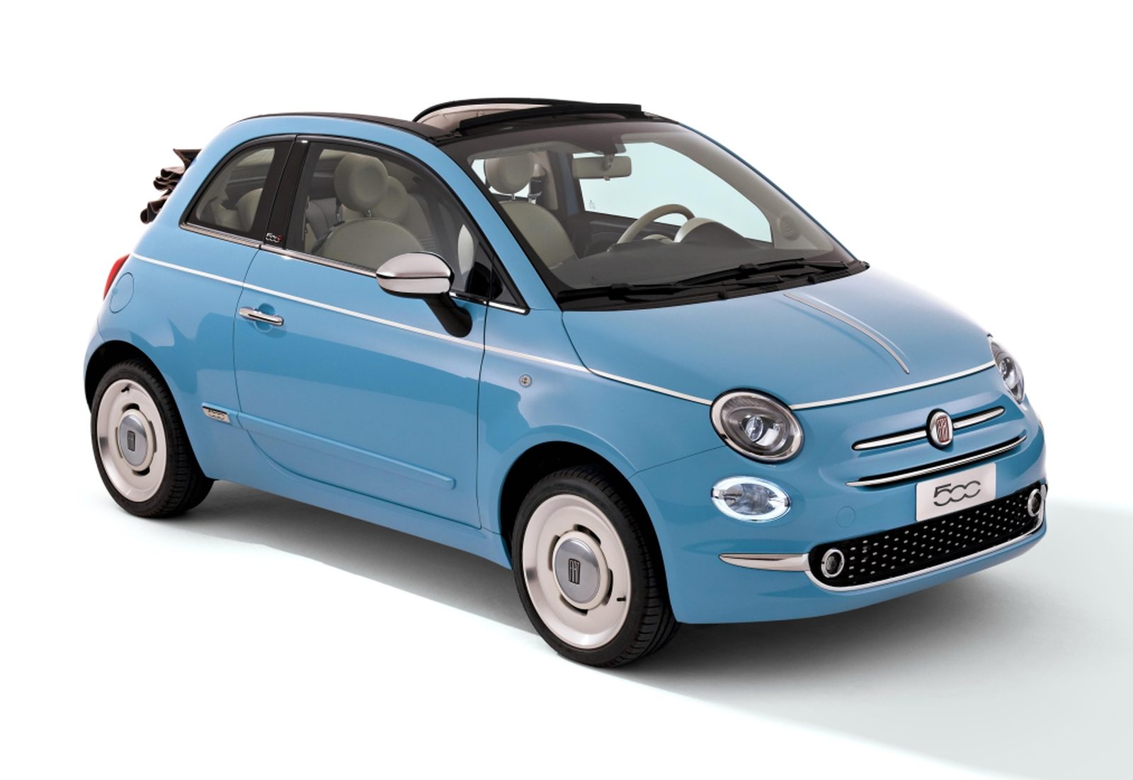 Vintage logo’s, 16-inch lichtmetalen wielen, beschermstrips met 500-logo, verchroomde buitenspiegelkappen, een beige softtop, een wit biesje over de zijkant, het tweekleurige interieur en de speciale kleur Volare Blue zijn kenmerken van het jubileummodel. Het exclusieve interieur wordt gecompleteerd met specifieke vloermatten en een stuurwiel met vintage logo.