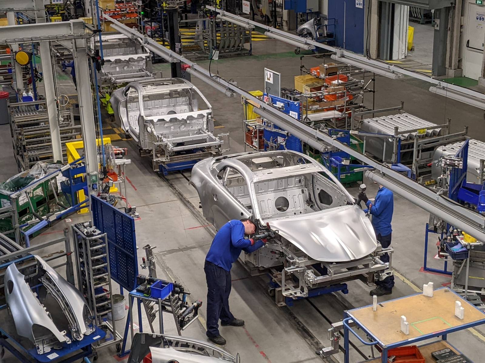 Nadat het zelfdragende chassis voor een groot gedeelte aan elkaar gelijmd is, monteren robots het dak, waarna medewerkers enkele zijpanelen en de motorkap en achterklep monteren. Met meetapparatuur en een rubberen hamer lopen de medewerkers alle panelen zorgvuldig na en checken of ze naadloos op elkaar aansluiten. Vervolgens krijgt de auto een duwtje richting de volgende hal.