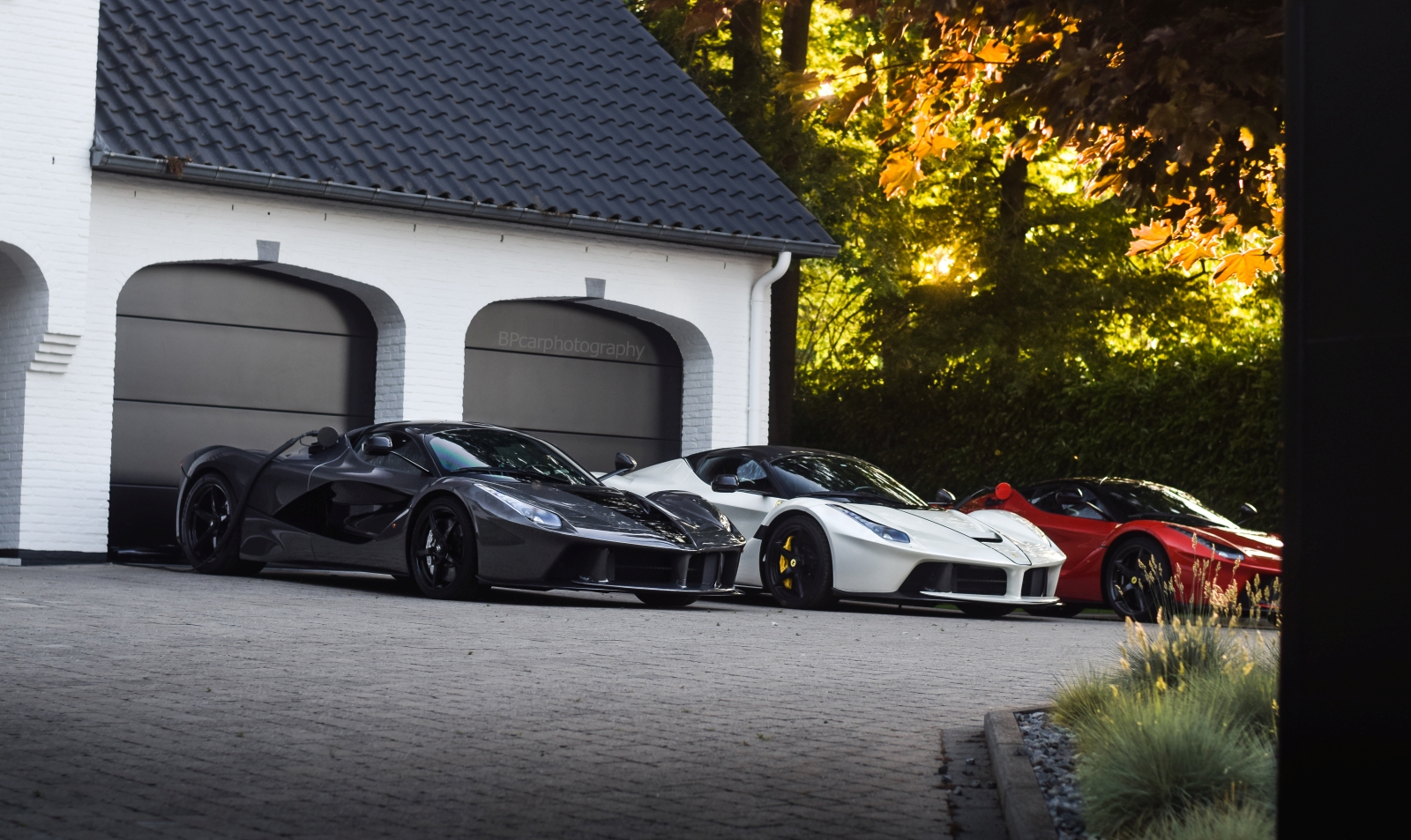 Het bijzonder exclusieve trio werd gespot door Instagrammer BPcarphotography op een oprit in de omgeving van Maastricht, vlak over grens met België. De grijze en witte LaFerrari staan op geel kenteken, de rode is voorzien van een Belgische plaat. Het witte exemplaar is overigens niet zomaar een LaFerrari, maar een Spider-variant. Bij de LaFerrari wordt dit — net als bij andere gelimiteerde exemplaren — een Aperta genoemd. Bij deze dakloze variant moet je de hardtop er handmatig afhalen. Vervolgens kun je hem in de bagageruimte aan de voorkant plaatsen.