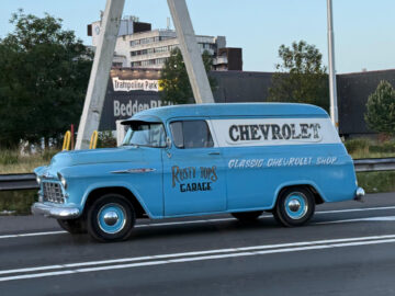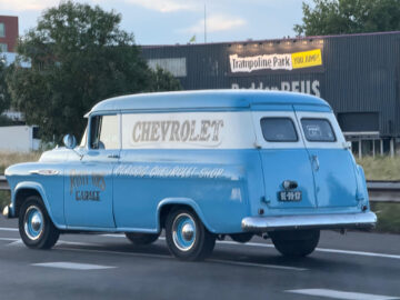 Op de A12 ter hoogte van Reeuwijk zagen wij deze erg mooi (vrijwel) origineel gebleven Chevrolet 3100 Panel Van uit 1956, die sinds 2021 in Nederland is. Ook op kenteken is het nog steeds een ‘gewone’ bestelbus. Een leuke afwisseling op de pick-ups en Suburbans, want bestelbussen halen het meestal niet tot de oldtimerleeftijd. Laat staan dat ze een gewone bestelbus blijven en niet worden omgebouwd tot camper of iets dergelijks.