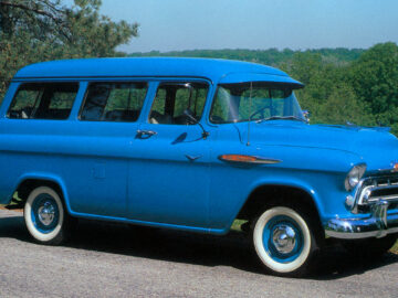 Het door ons gespotte exemplaar is een Chevrolet Panel Van van de vierde generatie, die voor modeljaar 1955 op de markt kwam. De pick-up-lijn was vrijwel volledig nieuw ontworpen en de afgeleide Suburban en Panel Van dus ook. Naast de veel modernere vormgeving kregen de auto’s ook een wat lagere bouw, al blijft het natuurlijk een hoger model dan een gewone personenauto.