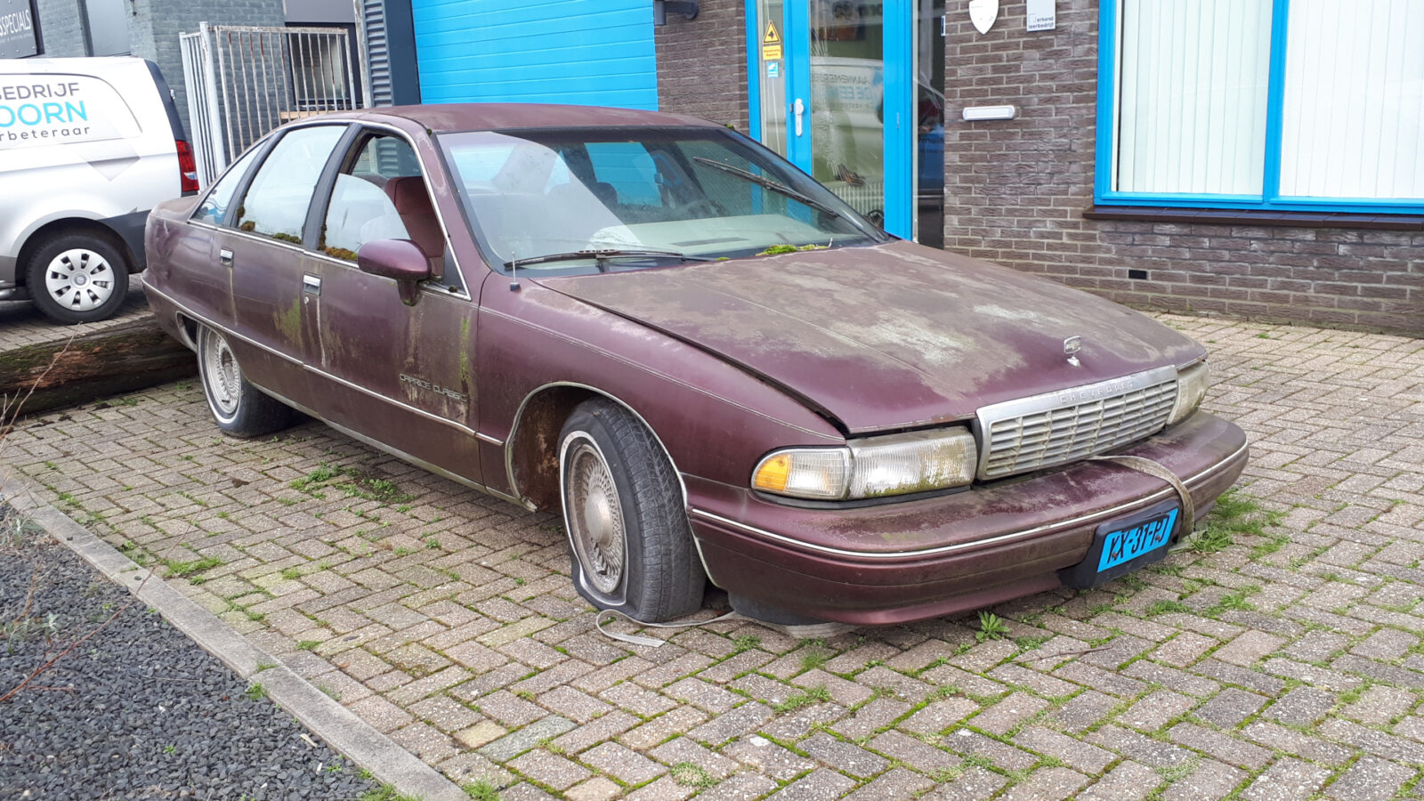 De Chevrolet Caprice Classic is origineel Nederlands en destijds direct in gebruik genomen als taxi. In zijn werkzame leven heeft de Chevy maar liefst een half miljoen luxueuze taxikilometers weggetikt, om vervolgens te worden afgedankt. De Caprice kreeg een tweede leven als donorauto. Het aannemersbedrijf heeft als gezamenlijke hobbyauto namelijk nog eenzelfde Caprice. Deze voormalig taxi is jarenlang gebruikt als onderdelendonor voor de hobby-Caprice. Nu is al het bruikbare wel zo’n beetje uit de auto gehaald. De Caprice stond altijd naast het pand, maar is nu voor de deur gezet om binnenkort te worden opgehaald voor definitieve afvoer.