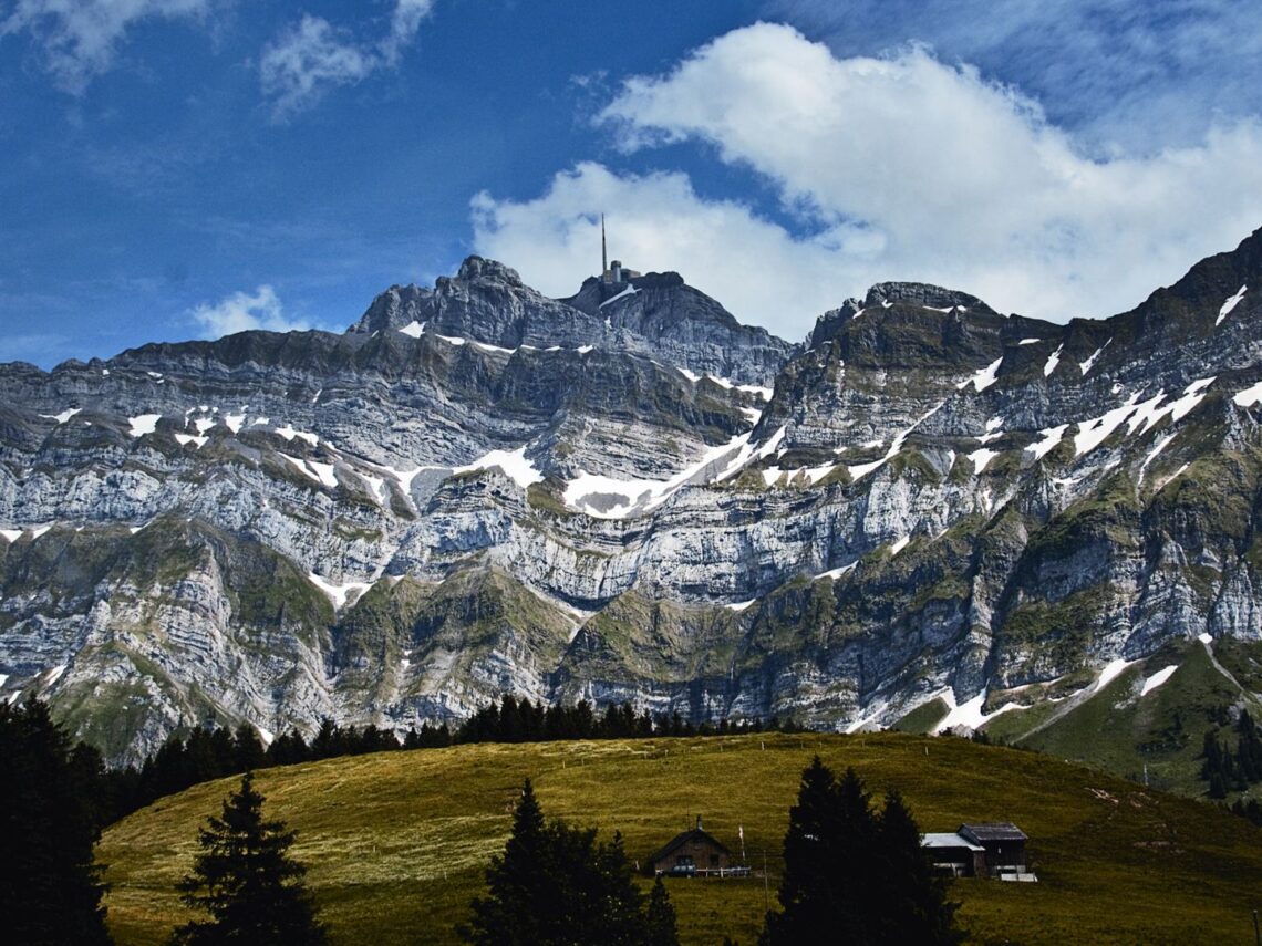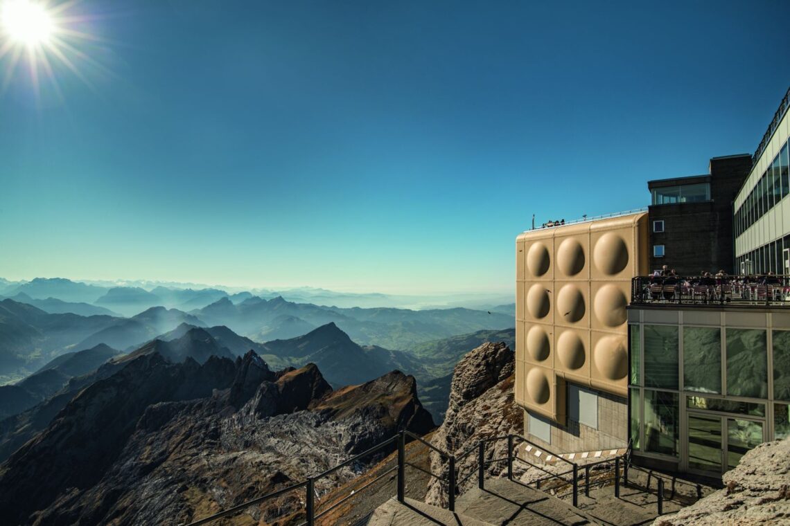 Na een kleine drie uur rijden komen we aan bij de Säntis. De berg ligt op het kruispunt van drie kantons – Appenzell Ausserrhoden, Appenzell Innerrhoden en St. Gallen – en is de 13e hoogste berg van de Alpen en de 29e hoogste top van Europa. Aan de voet van de Säntis ligt een kabelbaan die ieder half uur naar de top vertrekt. Vanaf boven zie je, als het weer meewerkt, zes landen tegelijk: Zwitserland, Duitsland, Oostenrijk, Liechtenstein, Frankrijk en Italië.