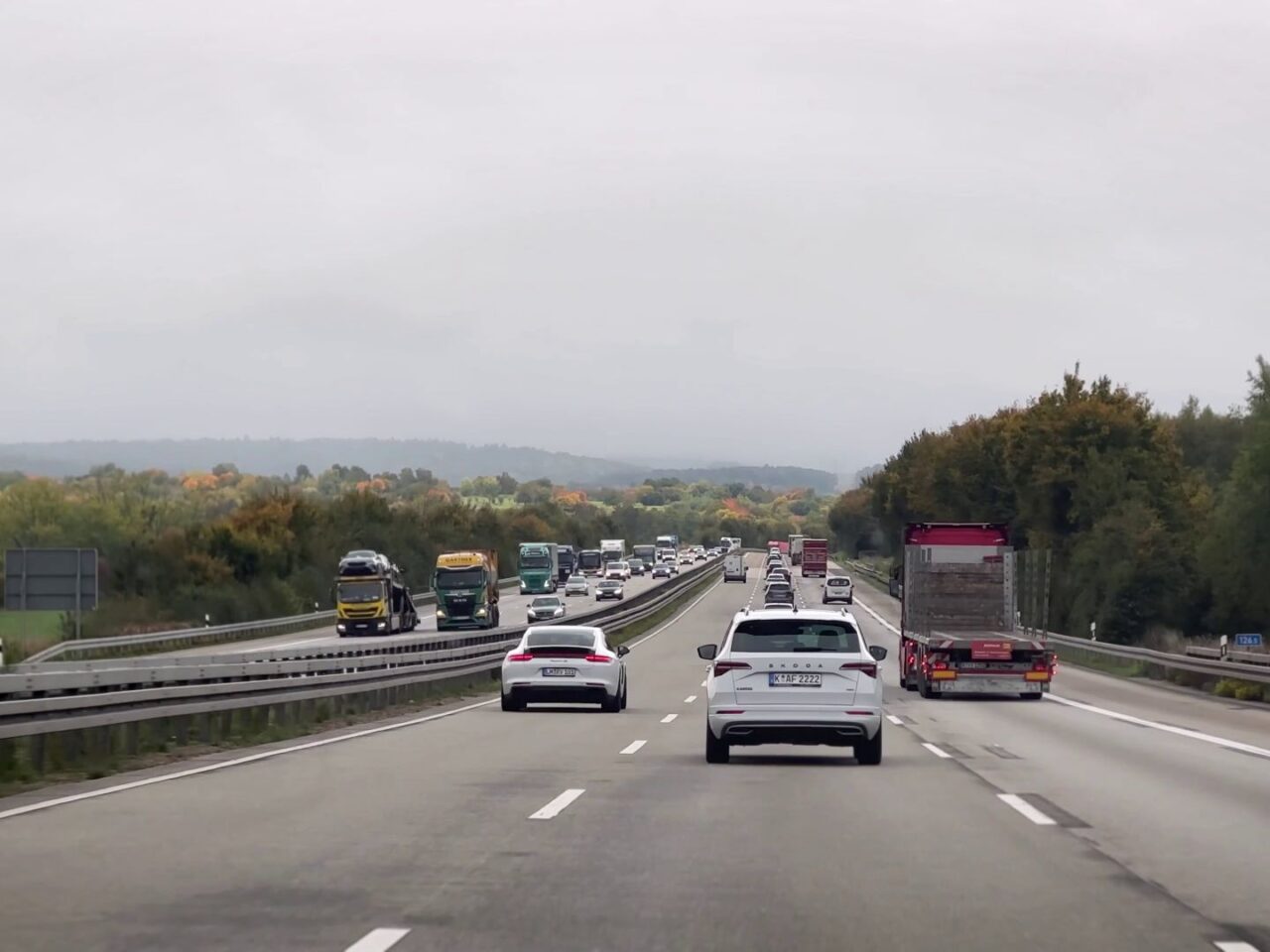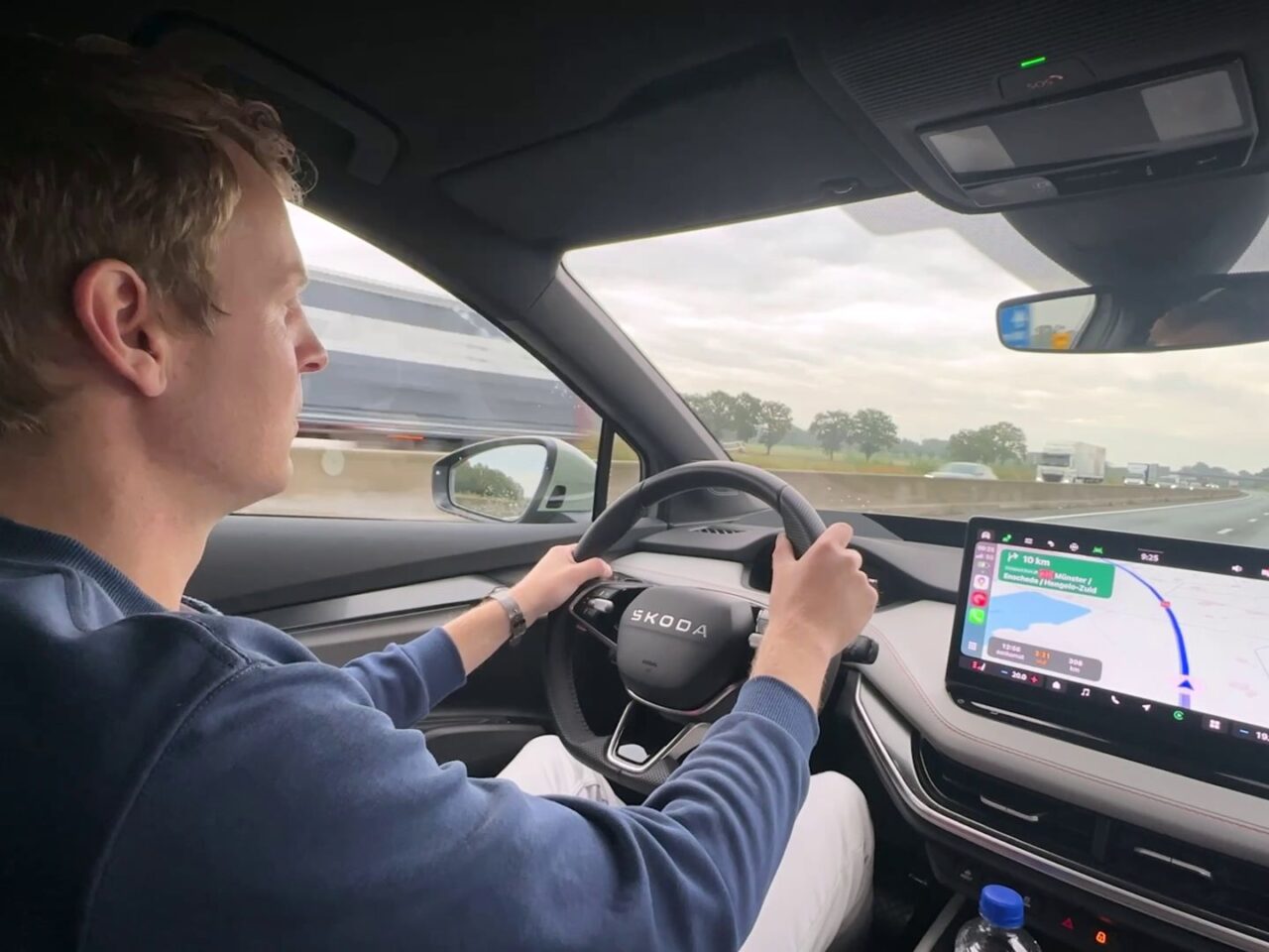 Onze reisauto is de Skoda Elroq 85, met een 77 kWh accupakket (571 WLTP-kilometer actieradius) en 210 kW (286 pk). In 6,6 seconden zit je op de 100 km/u – meer dan genoeg om met het verkeer mee te stromen op de Duitse Autobahn. Want daar begint ons avontuur echt. Bij Enschede steken we de grens over, richting Düsseldorf, Keulen, Frankfurt, Freiburg en het eindpunt van dag 1: Basel.