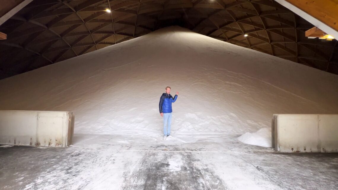 De volgende ochtend begint letterlijk zoutig. We bezoeken Salina Helvetica, een gigantische zoutfabriek een paar minuten buiten Basel. Hier ligt een enorme voorraad strooizout – duizenden en duizenden tonnen. Het is een bizar gezicht: gigantische witte bergen zout – soms meter dan 30 meter hoog – die Zwitserland door de strengste winters helpen. En ja, als toerist kun je een rondleiding krijgen door de fabriek en langs de bergen zout – een dikke aanrader.