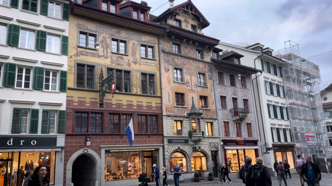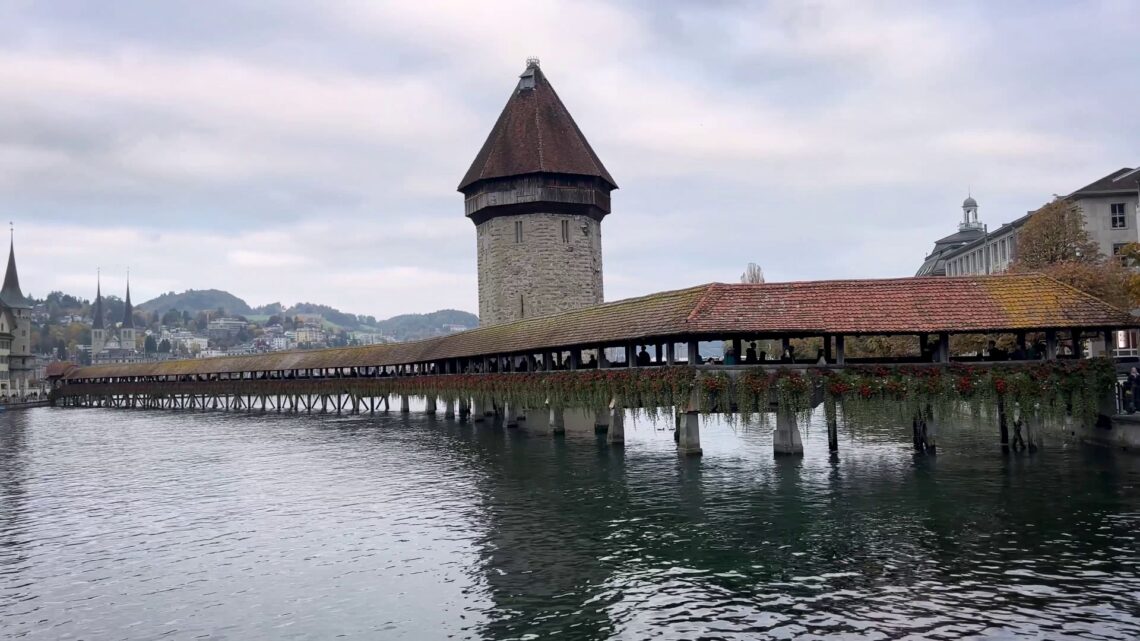 In Luzern zetten we de Skoda in een parkeergarage aan een laadpaal – die vind je ook in Zwitserland op elke hoek. De stad zelf is een ansichtkaart. De stad ademt geschiedenis, met middeleeuwse gevels en kronkelende straatjes. Het hoogtepunt is de Kapelbrug, een houten brug uit 1365, waar je gewoon gratis op mag.