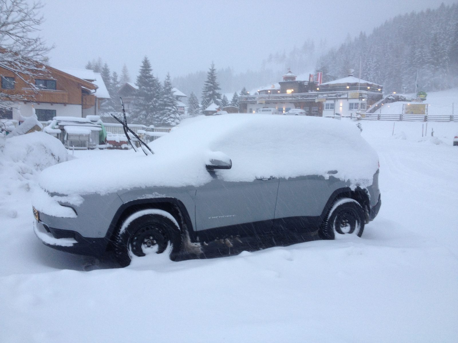 Flinke sneeuwval ontneemt bijna alle zicht in de Jeep Cherokee. Op het wegdek ligt al een flinke laag. Dus slaat de twijfel toe als we vanuit het dal flink stijl omhoog moeten. Kettingen pakken en om de banden leggen? Een Tsjechisch gezin in een Skoda Octavia stationwagen voor ons neemt het zekere voor het onzekere. Tegelijk rijdt een Oostenrijker met een Nissan pickup gewoon door. Dan moet de Jeep Cherokee dat toch ook kunnen, dus draaien we de schakelaar van de vierwielaandrijving in de stand -snow- en rijden maar. Het gaat probleemloos. Zelfs bij wat extra gas blijft de grip optimaal, terwijl de dieselmotor (147 kW/200 pk en 440 Nm trekkracht) voelbaar stevig wat power ontwikkelt.