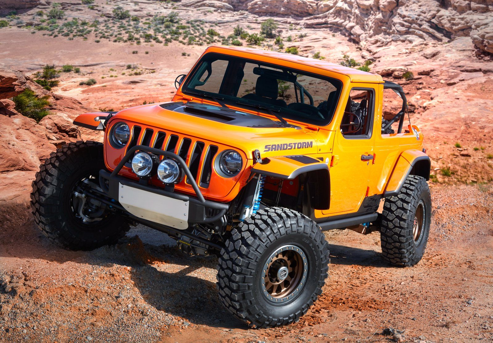 De Jeep Sandstorm is geïnspireerd op Baja-woestijnracers en heeft de benodigde hardware om serieus en op hoge snelheid door het mulle zand te knallen. De banden zijn van het type BF Goodrich Krawler, ideaal voor off-roadgebruik. Voorin de Sandstorm lepelt Jeep een 6,4-liter V8 met diverse upgrades van Mopar. Schakelen gebeurt met een handgeschakelde zesbak.