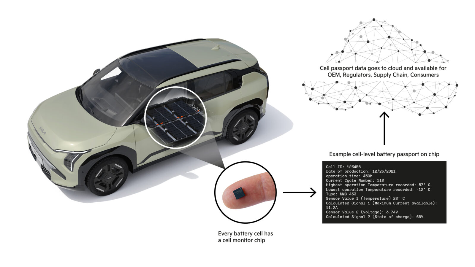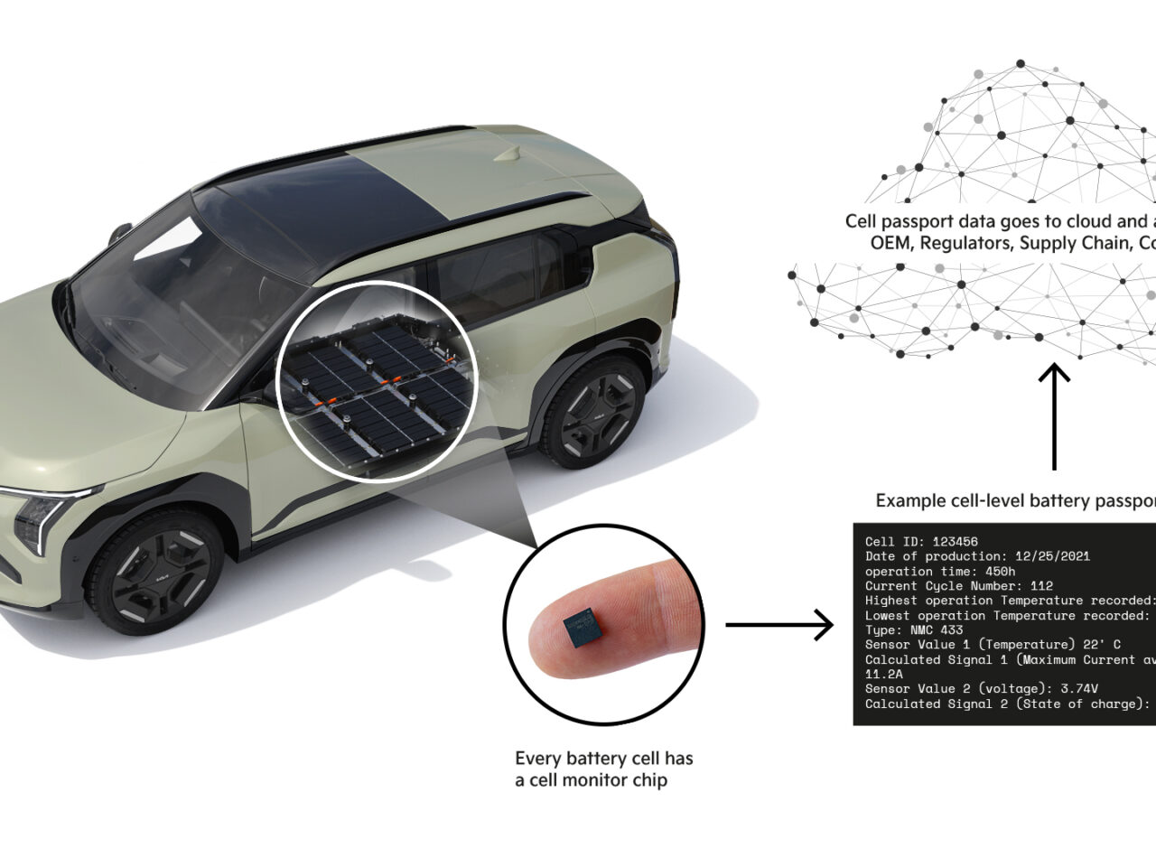 Een batterijpaspoort is een digitaal document dat inzicht geeft in de geschiedenis, chemie, kwaliteit en herkomst van een batterijcel. Kia test dit paspoort nu op het fijnste niveau: per individuele cel in de batterij. Zo kun je straks terugvinden welke materialen zijn gebruikt, waar ze zijn geproduceerd en welke milieuprestaties de cel heeft geleverd.
