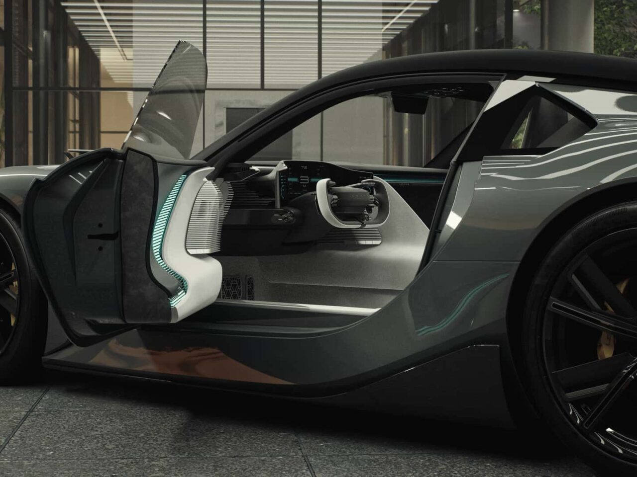 De Sport Concept heeft een interieur dat zich volledig richt op de bestuurder. Die wordt omringd door schermen, knoppen en een yoke-stuur. Alles ademt één ding: focus. Lexus noemt het zelf een “cocon-achtig” interieur. De scheiding tussen bestuurder en passagier is letterlijk voelbaar dankzij een hoge middenconsole die het interieur een beetje in tweeën deelt.