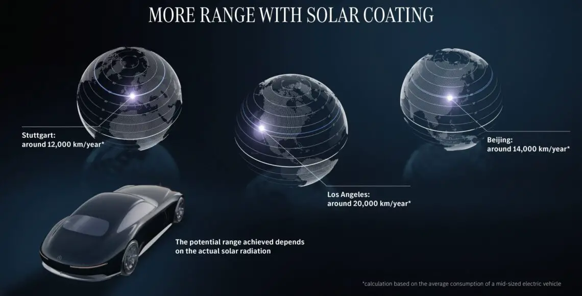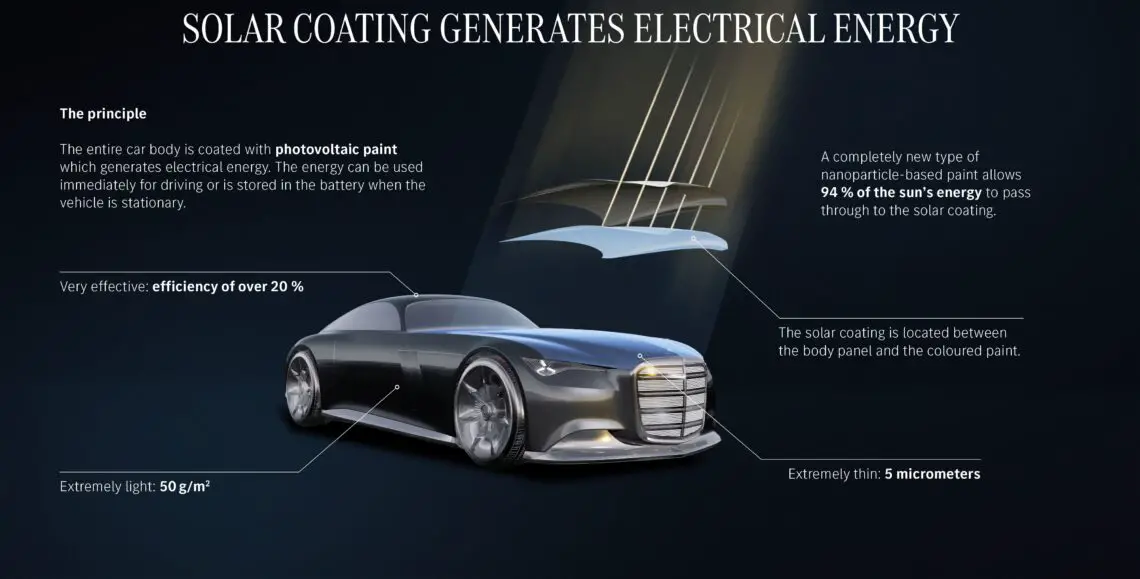 Zo zou een oppervlakte van 11 vierkante meter – gelijk aan het oppervlak van een middelgrote SUV – voldoende energie kunnen opwekken voor maximaal 12.000 kilometer per jaar. Dit is volgens de onderzoekers gebaseerd op ideale omstandigheden in Stuttgart, de thuishaven van Mercedes-Benz. Op plekken waar vaker de zon schijnt, bijvoorbeeld in Los Angeles, kan de fotovoltaïsche lak zelfs voldoende stroom opwekken om 20.000 kilometer per jaar gratis te rijden. De zonnecellen hebben een hoog rendement van 20% en wekken continu energie op, zelfs wanneer de auto is uitgeschakeld. Laten we hopen dat Mercedes-Benz deze technologie zodanig verder ontwikkelt dat de fotovoltaïsche lak voor betaalbare prijzen beschikbaar wordt voor consumenten. Want dit klinkt als een geweldige technologie die we allemaal op onze elektrische auto willen hebben, toch?