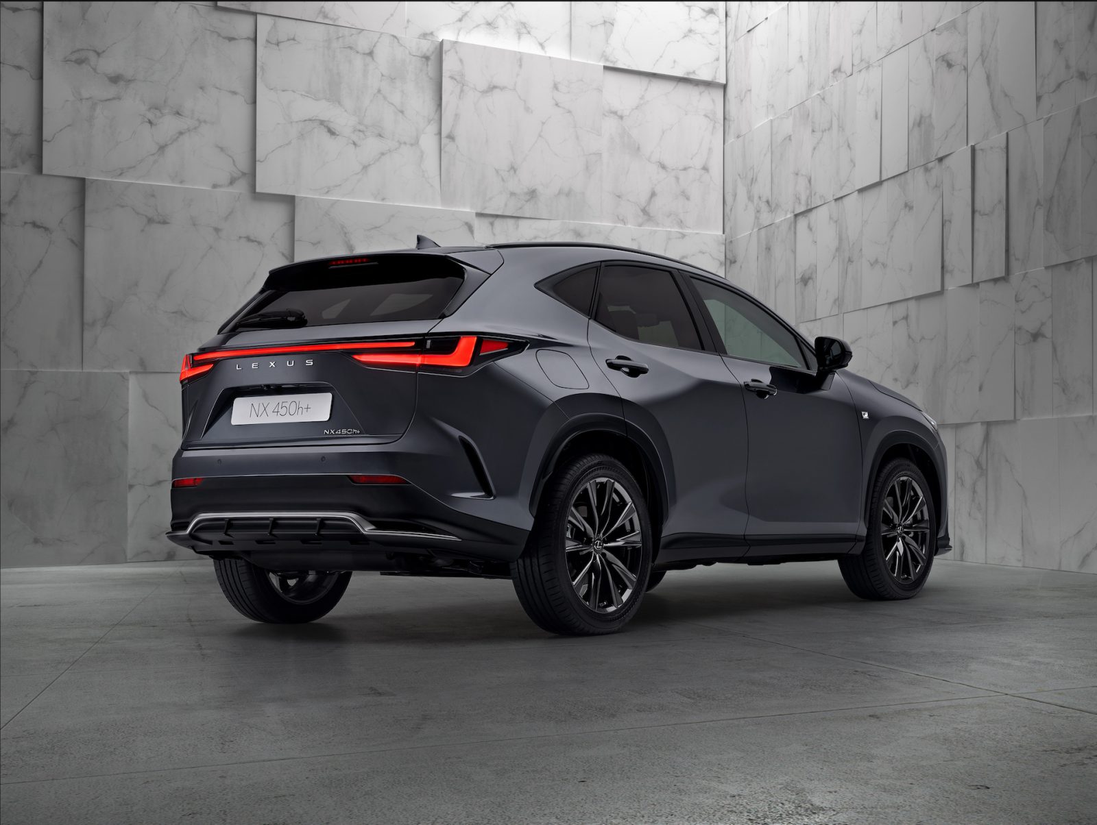 Nog veel interessanter is de komst van de NX450h+, de eerste plug-in hybride van Lexus. Deze motorvariant heeft dezelfde techniek als de Toyota RAV4 Plug-in Hybrid en Suzuki Across Plug-in Hybrid. De PHEV-aandrijflijn is 306 pk sterk, sprint in 6 seconden naar 100 km/u en heeft dankzij een 18,1 kWh lithium-ion batterij een elektrische range van 63 kilometer (WLTP). Het accupakket is laag in de bodem geplaatst. Zodoende gaat er geen bagageruimte verloren, want die is gelijk aan die van de NX350h. De NX450h+ kan tot een snelheid van 135 km/u volledig elektrisch rijden. De laadkabels voor de accu zijn ondergebracht in een handig opbergvak onder de vloer van de bagageruimte.