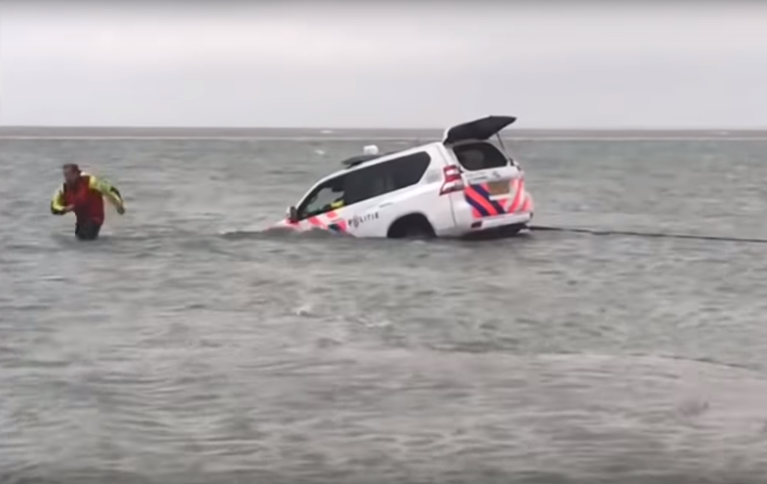 Ja, je ziet het goed. Een politiejeep in de zee. Hoe dat kan? Een agent probeerde gistermiddag met een dappere poging een burger van een zandplaat te redden, voor de kust van Renesse. Helaas voor beiden lukte dat niet op tijd. De man en de agent hebben zich zwemmend moeten redden. Pas rond 20.30 uur, toen het water weer gezakt was, kon de kustwacht de Toyota Land Cruiser van de politie lostrekken. Gelukkig maken de heren het goed.