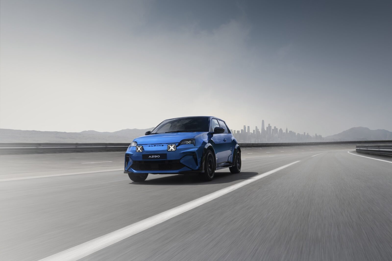 Een blauwe Renault 5 rijdt op een lege snelweg met op de achtergrond de skyline van een verre stad onder een bewolkte hemel.
