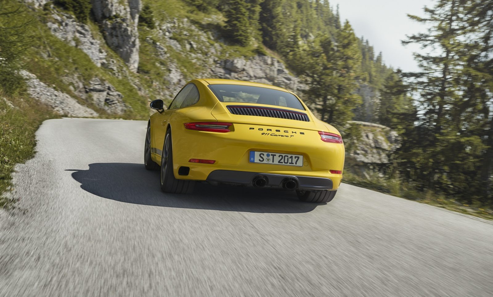 In een notendop krijg je het volgende: minder gewicht, kortere overbrengingen van de handgeschakelde zevenbak en achterwielaandrijving met een mechanisch sperdifferentieel. De Carrera T is verder leverbaar met zaken die niet op een ‘normale’ Carrera leverbaar zijn, zoals een PASM-sportonderstel (-10 mm rijhoogte), een iets lichter Sport Chrono Pakket (stopwatch op het dashboard ontbreekt), een kortere versnellingspook met rood schakelpatroon op de pookknop en sportstoelen waarvan het centrale deel met Sport-Tex is bekleed. Ook uniek: de 911 Carrera T is leverbaar met achterasbesturing.