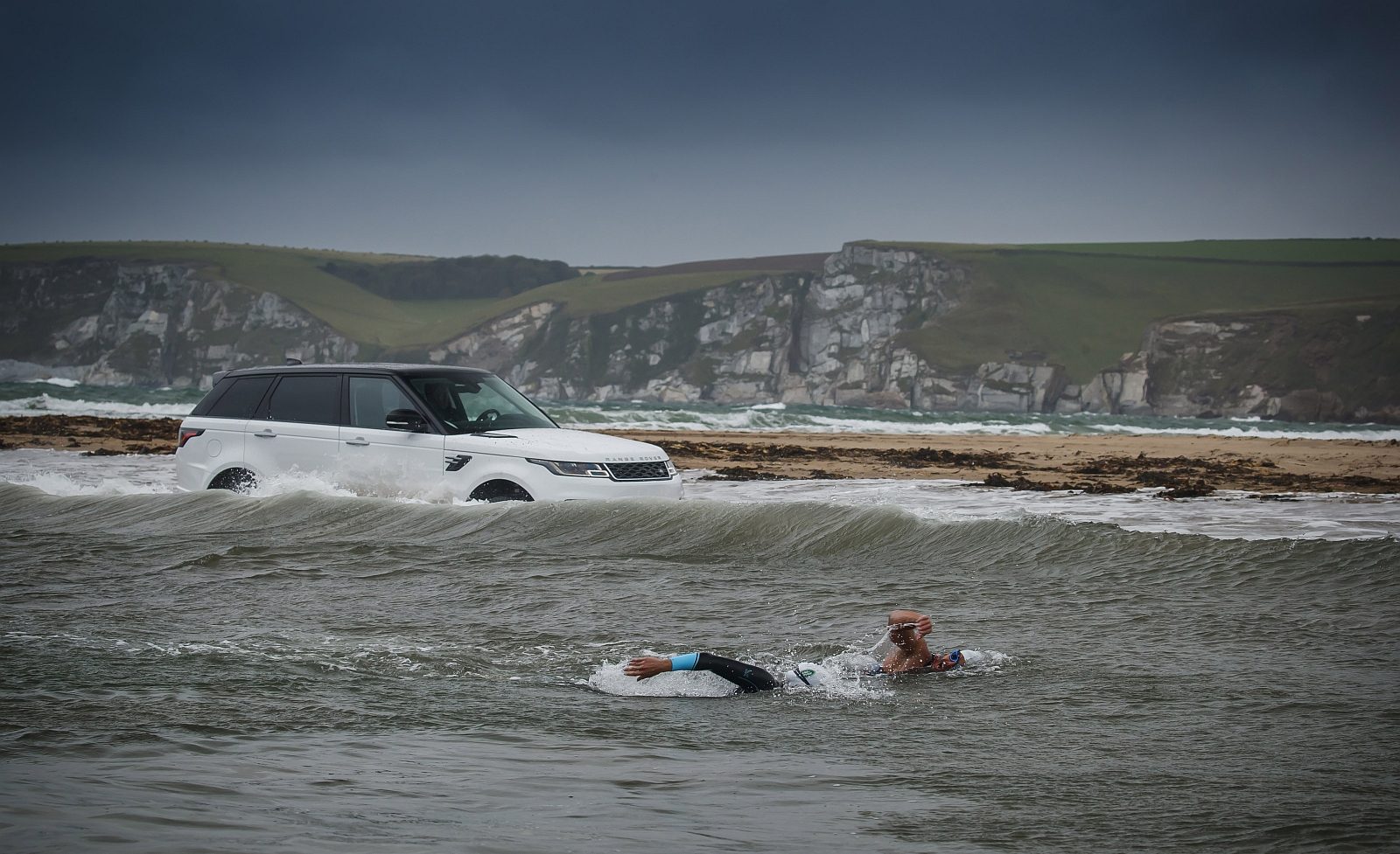 Payne en Edgley zwommen 1,5 kilometer langs de veranderlijke kustlijn en duldden extreem hoge golfen, terwijl de Range Rover Sport P400e op een 14 kilometer lang parcours van Bantham Beach naar Burgh Island in South Devon in het Verenigd Koninkrijk mul zand, getijden en zeewater tot wel 85 centimeter diep trotseerde.