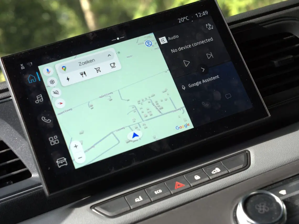 Het interieur is ruim opgezet, met veel praktische opbergmogelijkheden: vakken in het dashboard, lades, ruimte onder de passagiersbank en een neerklapbare rugleuning die als werkblad fungeert. Het standaard 10-inch touchscreen voelt aan als een smartphone en ondersteunt Android Auto en Apple CarPlay. Optioneel zijn Google Maps en Google Assistant geïntegreerd. Ideaal, want Google Maps is simpelweg het meest gedetailleerde navigatiesysteem dat er is.