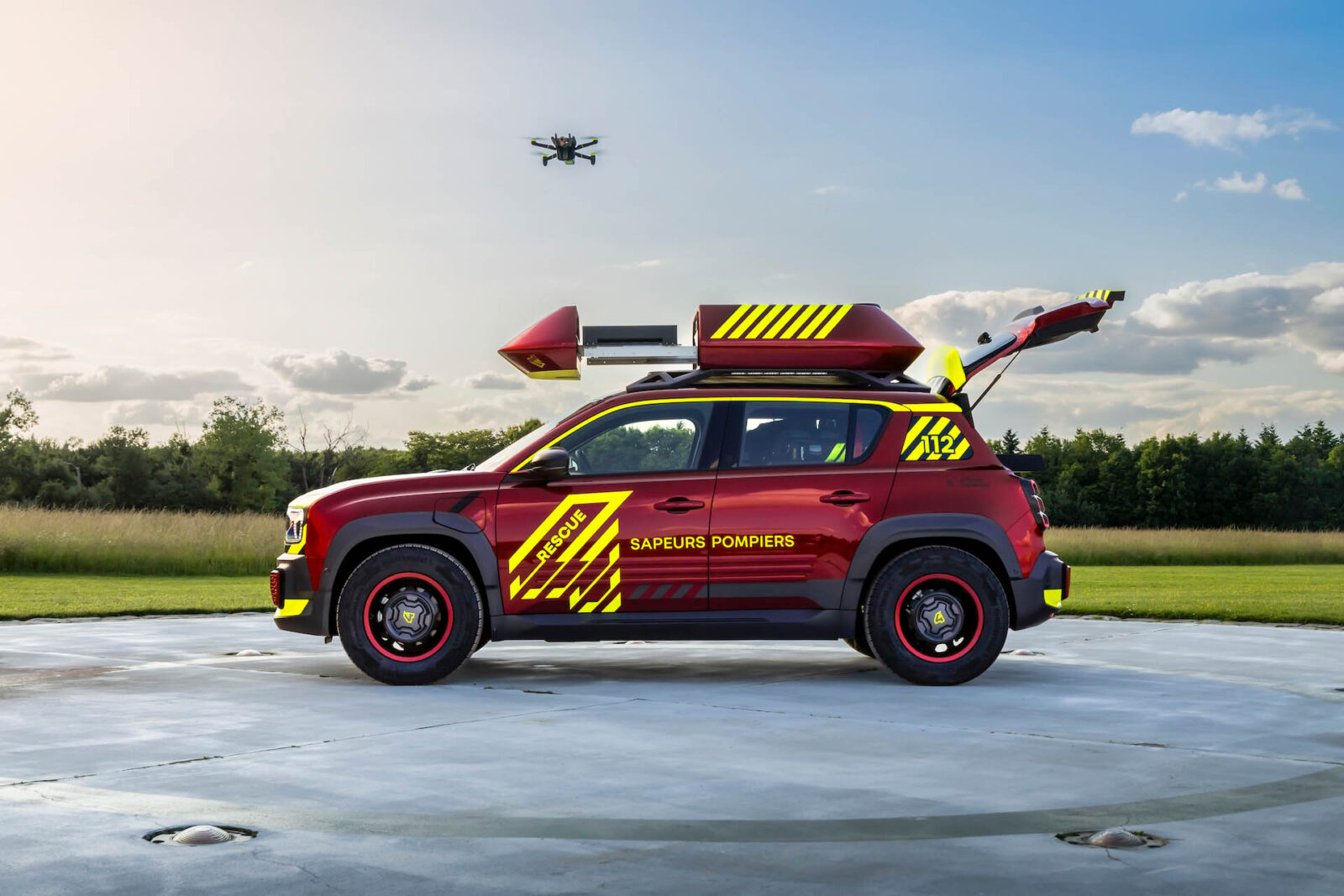 Het uiterlijk van de Vision 4rescue is ontworpen met actie in gedachten. De motorkap en het dak zijn voorzien van een donkergrijs visgraatpatroon dat doet denken aan technische markeringen. Fluorescerende accenten verwijzen naar noodsignalen en de branding van Renault 4 E-Tech electric. Op de zijkanten staan groot de woorden ‘RESCUE’ en ‘SAPEURS POMPIERS’, met op de achterzijde de noodnummers 112 en 18. Het uiterlijk van de auto is dus niet alleen opvallend, maar ook functioneel.