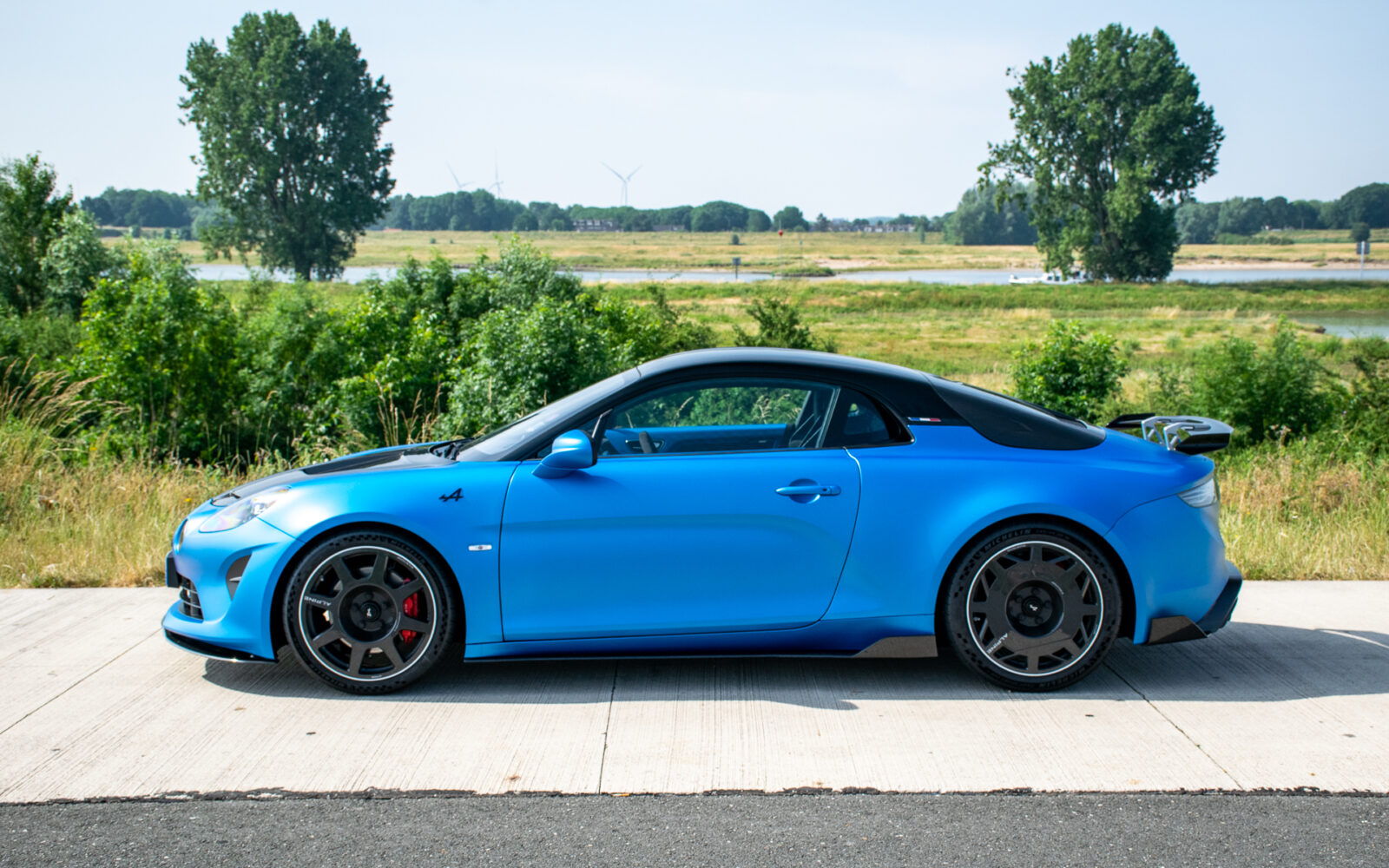 Bij Alpine Centre Soestdijk krijg ik de sleutelkaart van één van de drie blauwe A110R’s, die buiten keurig in het gelid staan, toegeschoven voor deze review. Een medewerker van Alpine zegt er nog even bij dat het hier wel gaat om een ‘serieuze auto’. Ten overvloede, want ik loop een rondje om de A110R en het koolstofvezel schittert me tegemoet. Niet alleen de kofferklep, het dak en de motorkap, maar zelfs de wielen zijn van het lichte doch sterke materiaal gemaakt. Ik slik even. Je wil natuurlijk niet degene zijn die per ongeluk een stoeprandje meepakt met deze wielen. Misschien had ik de avond van tevoren toch maar niet de prijzen op moeten zoeken: ongeveer 4.000 euro. Per wiel. Oef.
