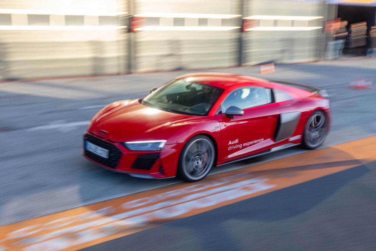 Met een vermogen van 456 kW (620 pk) is het niet niks waarmee je onderweg bent, maar toch laat de Audi R8 zich met een behoorlijk gemak over het circuit loodsen. Oké, bij de Audi Driving Experience zoeken we de limiet niet op, maar het tempo zit er zeker goed in. Vierwielaandrijving, tractiecontrole, ABS en ESP helpen natuurlijk ook, maar de Audi R8 lijkt op rails te rijden, zo strak is hij door bochten te sturen. Hij doet precies wat je wilt en je voelt je een met de auto. Tussen die bochten is op de rechte stukken weer ruimte voor een sprint. Ik wordt in de stoel gedrukt en de V10 huilt het weer uit: opnieuw kippenvel. Gas los wordt regelmatig beloond met sportief geplof en gepruttel uit de vuistdikke uitlaatpijpen. Heerlijk.