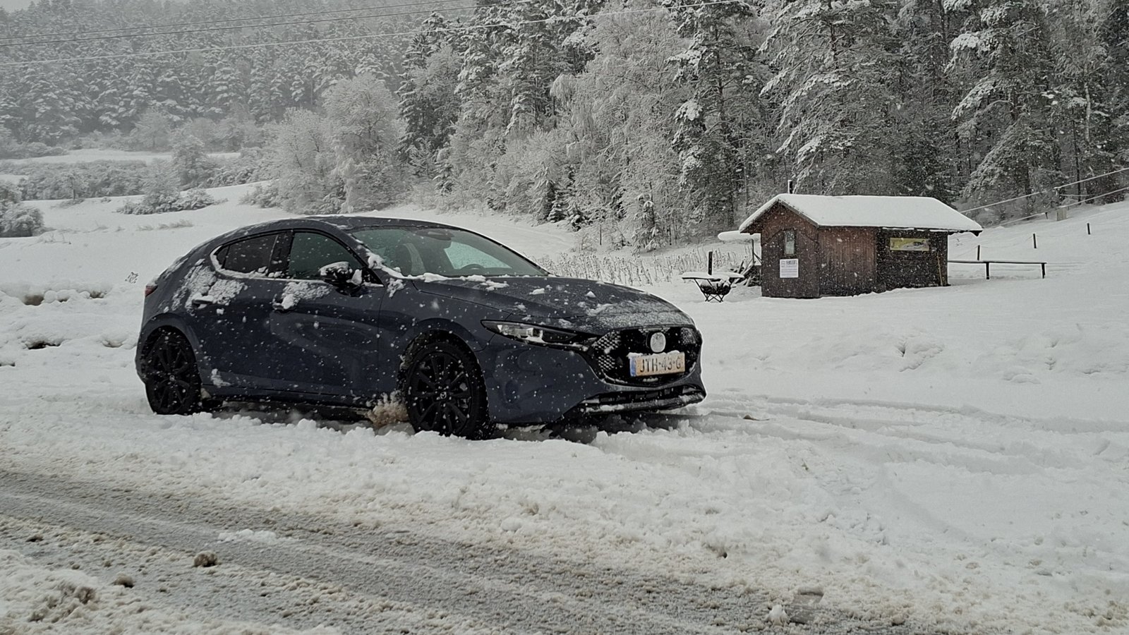 Het idee: lekker sturen over de kronkelige wegen van Beieren. De praktijk bij aankomst: Schnee, Schnee und noch mehr Schnee. Helaas moeten we concluderen dat de geplande route over kronkelende binnendoorwegen niet door gaat. Ja, de weg is begaanbaar, maar in die sneeuwprut kan de Mazda zijn kunnen niet volledig tonen. Overigens valt wel op dat de Mazda zich door de sneeuw niet van de wijs laat brengen. Hij laat zich er probleemloos en vol vertrouwen overheen sturen.