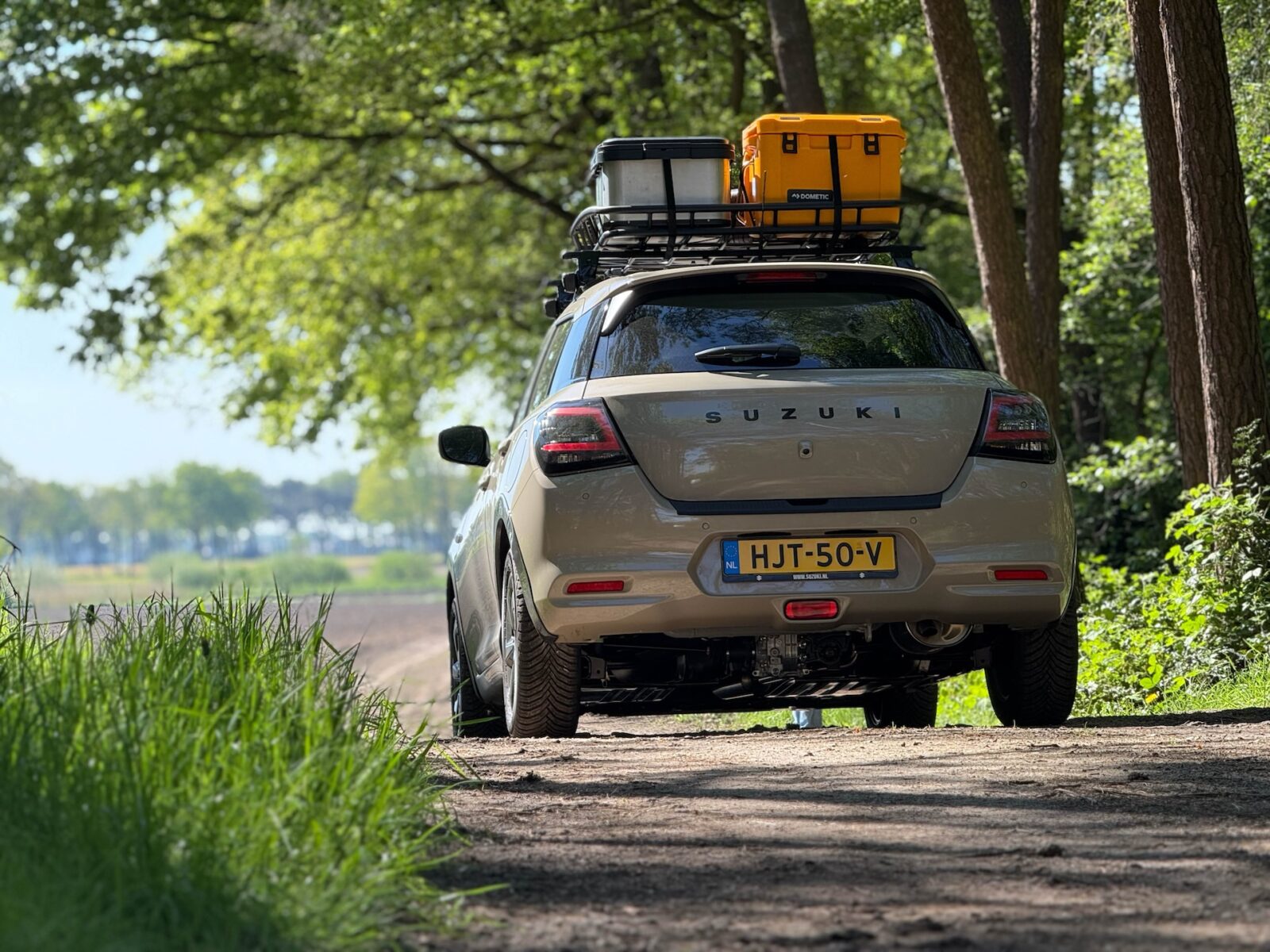 De uitvoering op de foto en in onze Suzuki Swift AllGrip videoreview is voorzien van extra accessoires die de auto een stoerdere look geven. Denk aan een Thule-dakrek, grovere allseason-banden (maat 195/55R16), glanzend zwarte velgen en wielkastverbreders. Ook zijn er zwarte Suzuki-logo’s, een rubberen beschermstrip op de achterbumper en opvallende AllGrip-stickers. Voor beter zicht in het donker is er een Tralert LED-bar op de grille gemonteerd. Binnenin vind je een Dometic koelbox en opbergbox, rubberen vloermatten en lederen bekleding.