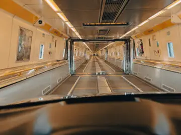 Spannend is LeShuttle niet. Integendeel zelfs. Alles staat keurig aangegeven en je krijgt ook per mail tijdig informatie over hoe je moet inchecken. Het inrijden van de autotrein is ook vrij eenvoudig. Eigenaren van een auto met een grote velg en lage bandwang moet even extra opletten. Want naast de rijstrook in de treinstellen ligt een drempel voor het loopgedeelte. Tijdens de reis – die bij elkaar ongeveer 35 minuten duurt – kun je hier bij of in je auto wachten. Tussen de auto’s in staan is verboden.
