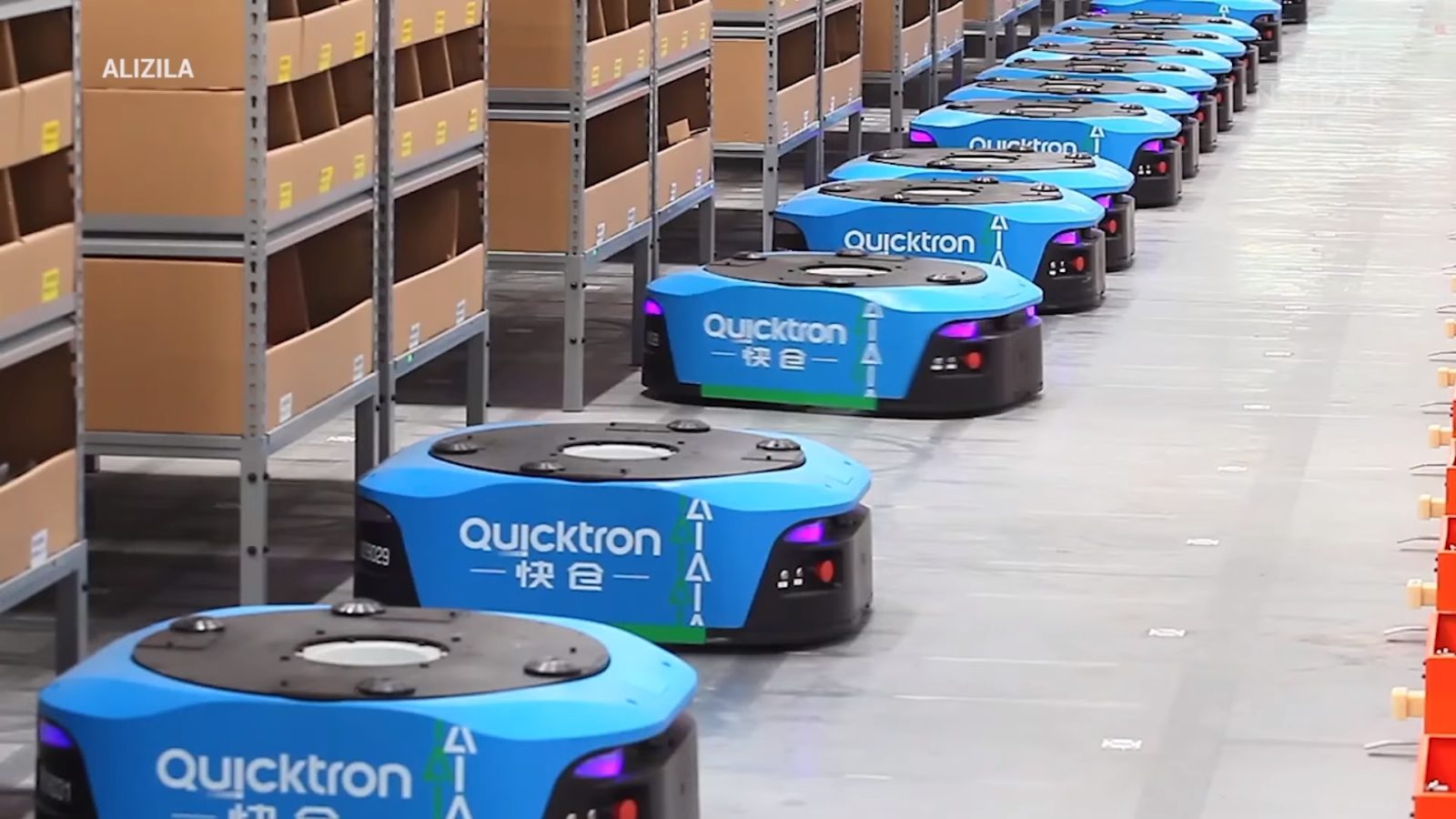 In een Chinees warenhuis van internetwinkelgigant Alibaba doen zestig autonoom rijdende robots ongeveer 70 procent van het werk. Sinds de komst van de robots is de productie zelfs verdrievoudigd. De technologie van deze blauwe Quicktron-robots is een voorbeeld voor volledig autonoom rijdende auto’s.