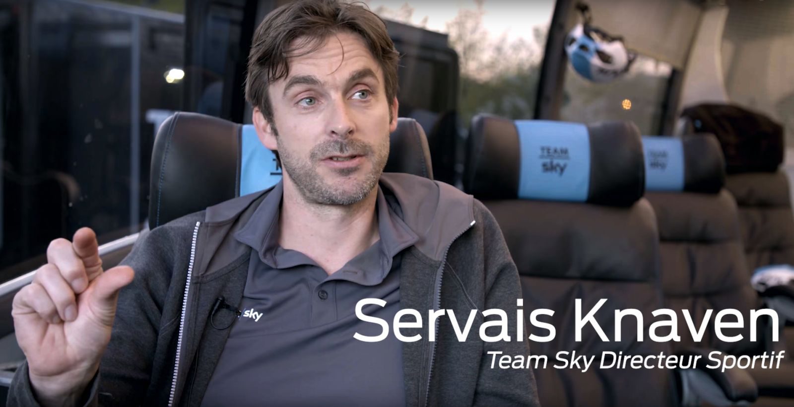 Ploegleider Team Sky over de auto tussen de fietsen