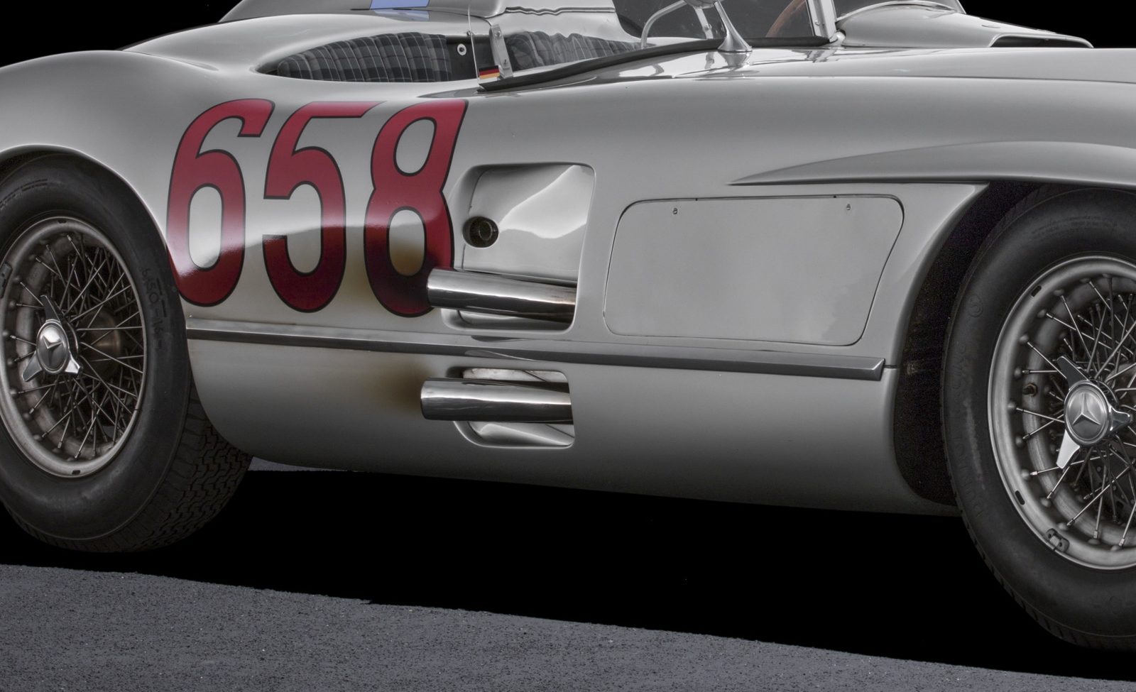 Het Louwman Museum: “Voor Nederland is de W 196 R met startnummer 8 er één met een gouden randje. In 1955 won regerend F1 wereldkampioen Juan Manuel Fangio in deze auto de Grand Prix van Nederland op Zandvoort met slechts 0,3 seconde voorsprong op Stirling Moss die een maand daarvoor met de 300 SLR de inmiddels legendarische overwinning in de loodzware Mille Miglia had behaald. Ook de Silver Arrow van Fangio met nummer 658 uit de Mille Miglia van dat jaar maakt deel uit van de expositie. Filmbeelden van deze wedstrijden begeleiden de tentoongestelde voertuigen.”