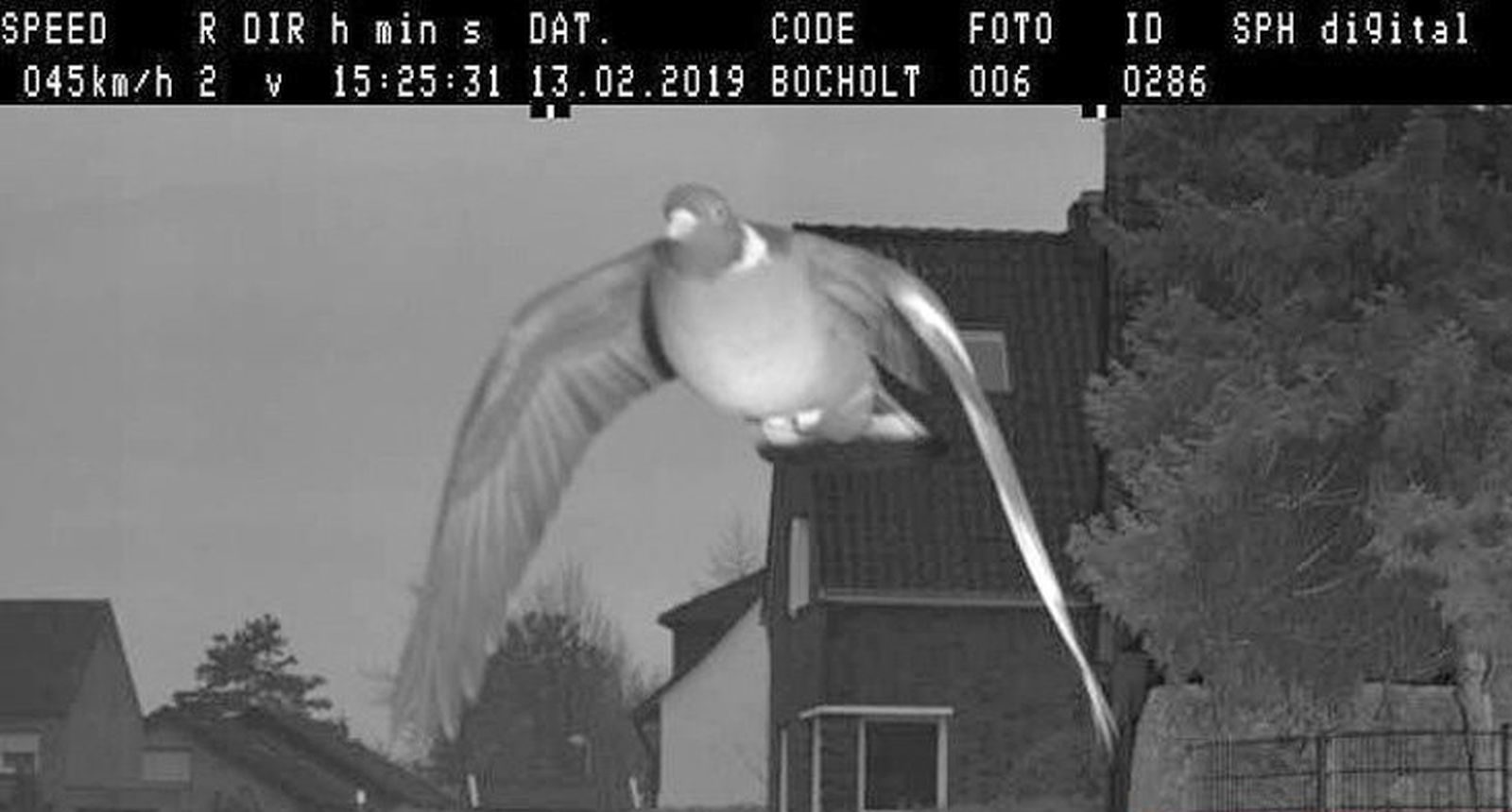 Een bon zal de duif niet krijgen, want een kenteken heeft hij niet. Geinig is het wel, deze ‘laagvlieger’ die de flitspaal wist te activeren.