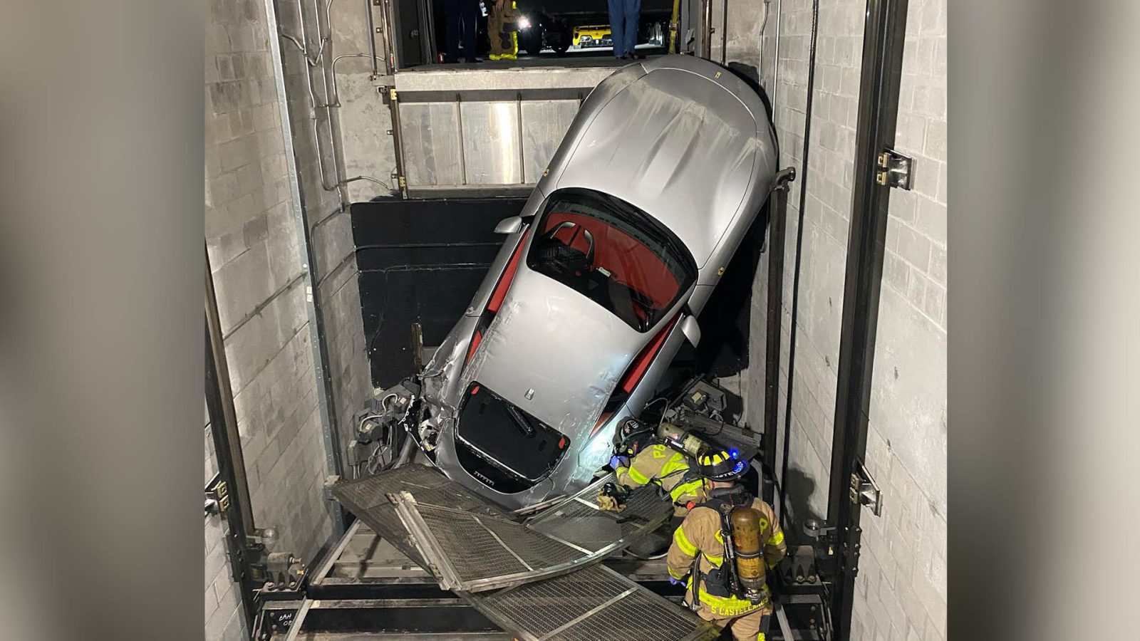 De brandweer van Palm Beach County werd afgelopen week opgeroepen voor een bijzonder ongeval. Een nieuwe Ferrari Roma was in een liftschacht gevallen en zat muurvast. De brandweer kon de auto niet zomaar verplaatsen. Hij lekte namelijk benzine. Daarom moest de stroom van het hele pand eraf. Toen het lek gedicht was, konden de brandweerlieden nadenken hoe ze de auto veilig uit de krappe ruimte konden verwijderen.