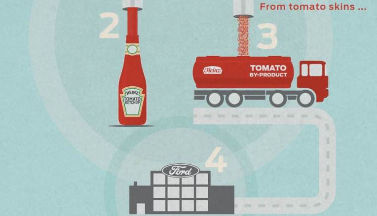 Heinz gebruikt elk jaar meer dan twee miljoen ton tomaten voor de productie van zijn meest verkochte product: ketchup. Onderzoekers bij Heinz en Ford zochten naar een toepassing voor de restanten van de productie: vellen, stelen en zaden van tomaten. Ze ontdekten dat gedroogde tomatenvellen verwerkt kunnen worden in composietmaterialen voor bijvoorbeeld steunklemmen en opbergbakjes. Heinz benadrukt dat de techniek zich nog in een zeer pril stadium bevindt en nog niet productierijp is. Sinds een aantal jaar maakt Ford steeds meer gebruik van biologische materialen waarin geen metaal voorkomt. Ford introduceerde eerder dit jaar al bedieningselementen uit materiaal dat versterkt is met cellulosevezels, en klemmen voor bedrading gevuld met rijstvliezen. Inmiddels maakt de autofabrikant gebruik van acht biologische materialen. Andere voorbeelden zijn composietmaterialen op basis van kokosnoot, gerecycled katoen voor matten en de bekleding van stoelen en de vulling van zittingen en hoofdsteunen van sojaschuim